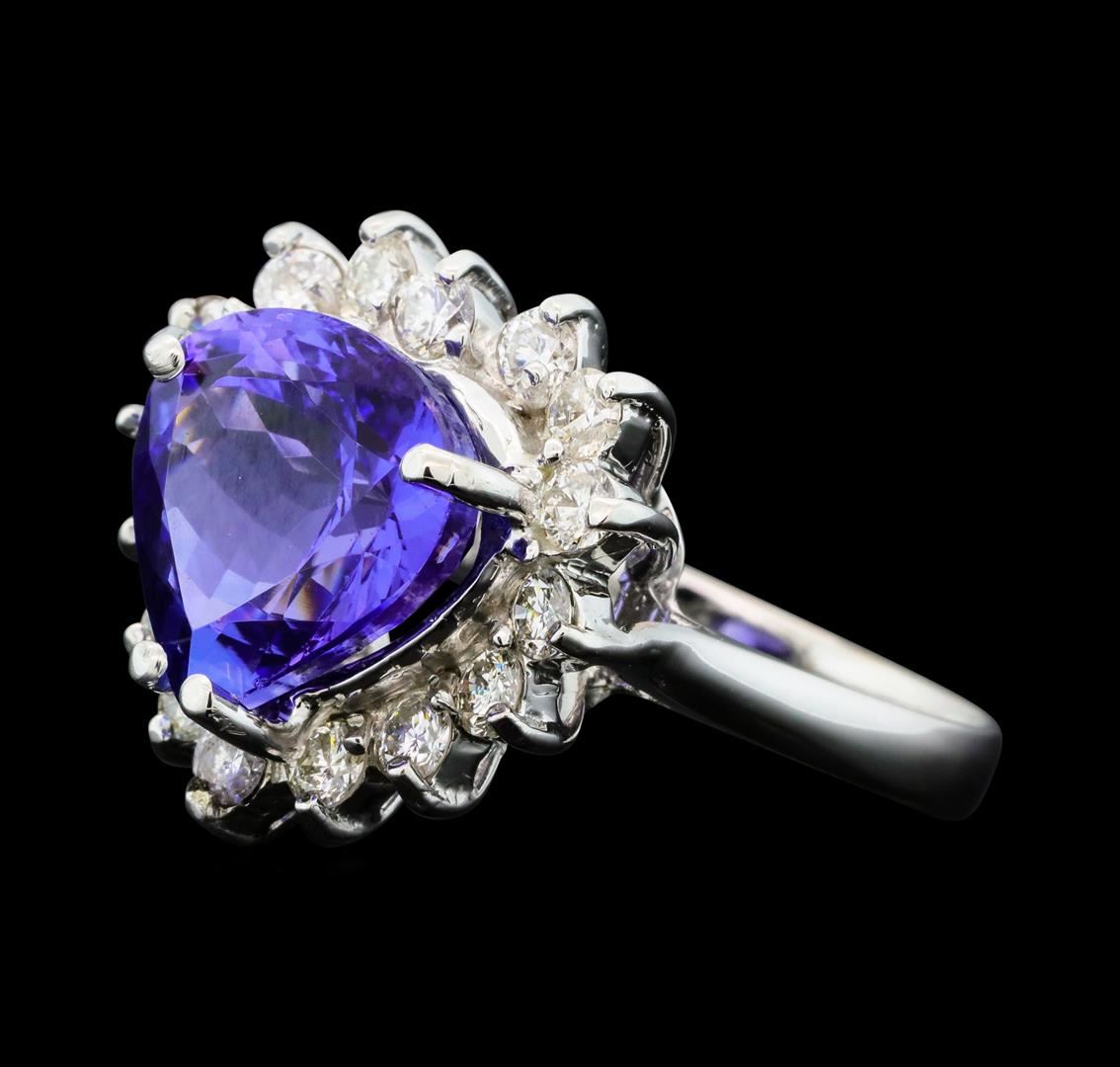 One electronically tested 14KT white gold lady's cast fashion ring with a basket halo with a bright polish finish. The featured lady's ring has a shank measuring 2.91 millimeters wide. Identified with markings of 'K14'. Condition is new, good workmanship. Containing: One prong set pear modified brilliant cut natural tanzanite, measuring 10.91 x 11.11 x 6.84mm, (depth est.) approximate weight of 5.25ct., clarity is eye clean, medium dark, moderately strong, violetish blue color, (GIA vB 6/4), cut is very good. Transmitting light with no distortion, transparent. Colored gemstones are presumed to have been subjected to commonly used enhancement processes. Graded in the setting. Sixteen prong set round brilliant cut diamonds, measuring 2.40 - 2.30 x 1.46mm (depth est.) approximate total weight of 16 Stones = 0.80ct. Graded in the setting. Color H - I Clarity SI-1 to SI-2 Cut Good. Total Weight of Colored Stones 5.25ct.. Total Weight of Diamonds 0.80ct.. Total Weight of Ring 6.30gm. GAS Appraised at $9,355.00.