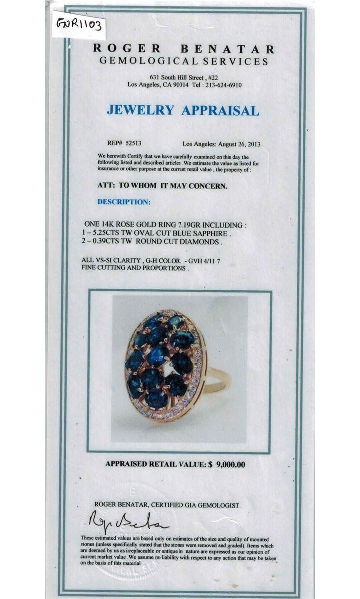 14K ROSE GOLD BLUE NATURAL CEYLON SAPPHIRE RING:7.19 GRAMS/DIAMOND:0.39CT/BLUE SAPPHIRE:5.25CT/#GVR1103