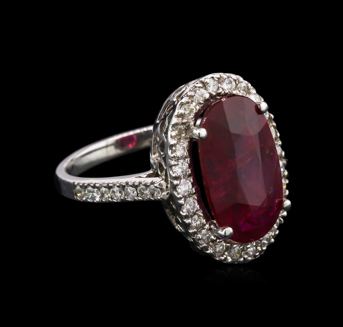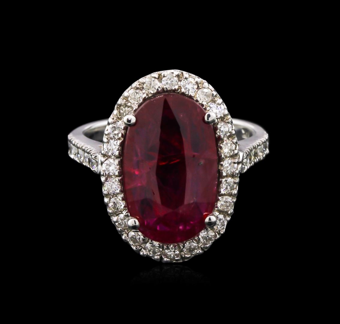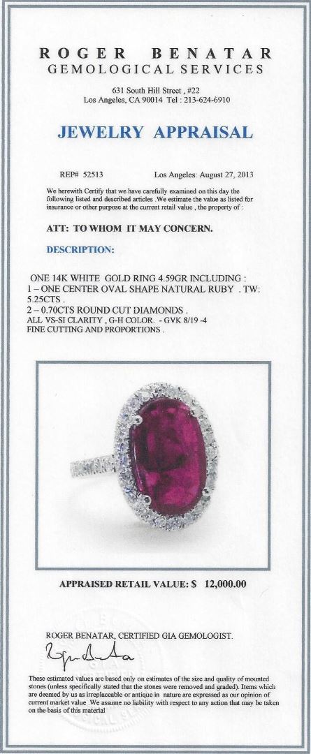 One 14K white gold ring 4.59gr including: 1- One center oval shape natural ruby. TW: 5.25cts. 2- 0.70cts round cut diamonds. All VS-SI clarity, G-H Color. - GVK 8/19 -4 Fine Cutting and Proportions. RBGS Appraised at $12,000.00.