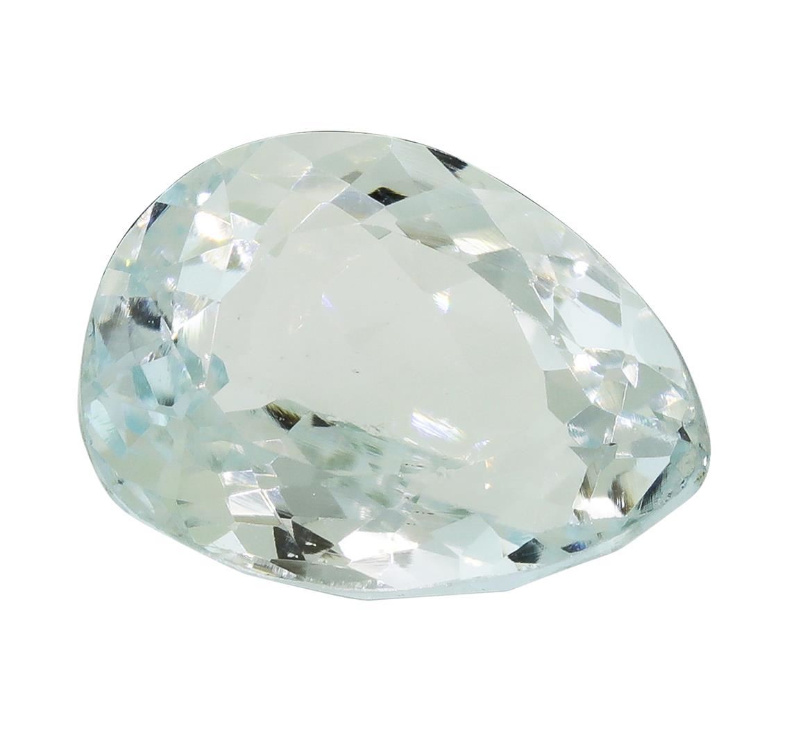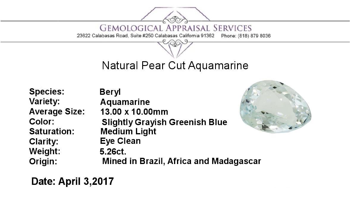 One natural pear cut aquamarine with an exact weight of 5.26ct., clarity is eye clean, slightly grayish greenish blue, medium light. Gemological Appraisals Services estimates the retail value at $2025.1 GAS Appraised.