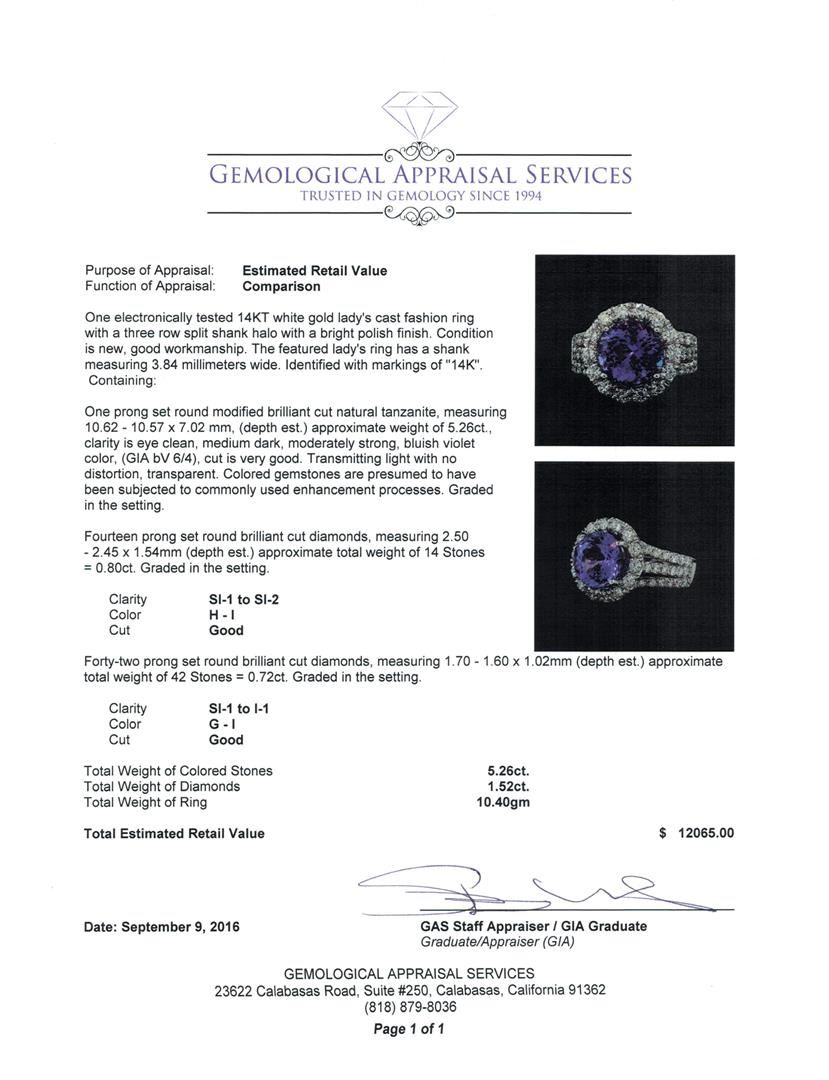 One electronically tested 14KT white gold lady's cast fashion ring with a three row split shank halo with a bright polish finish. The featured lady's ring has a shank measuring 3.84 millimeters wide. Identified with markings of '14K'. Condition is new, good workmanship. Containing: One prong set round modified brilliant cut natural tanzanite, measuring 10.62 - 10.57 x 7.02 mm, (depth est.) approximate weight of 5.26ct., clarity is eye clean, medium dark, moderately strong, bluish violet color, (GIA bV 6/4), cut is very good. Transmitting light with no distortion, transparent. Colored gemstones are presumed to have been subjected to commonly used enhancement processes. Graded in the setting. Fourteen prong set round brilliant cut diamonds, measuring 2.50 - 2.45 x 1.54mm (depth est.) approximate total weight of 14 Stones = 0.80ct. Graded in the setting. Clarity SI-1 to SI-2. Color: H - I Cut Good Forty-Two prong set round brilliant cut diamonds, measuring 1.70 - 1.60 x 1.02mm (depth est.) approximate total weight of 42 Stones = 0.72ct. Graded in the setting. Clarity SI-1 to I-1. Color: G - I Cut Good. Total Weight of Colored Stones 5.26ct.. Total Weight of Diamonds 1.52ct.. Total Weight of Ring 10.40gm GAS Appraised at $12,065.00.