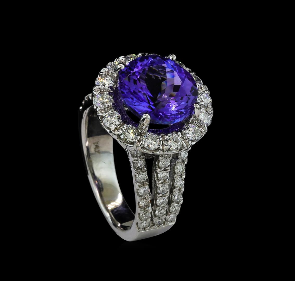 One electronically tested 14KT white gold lady's cast fashion ring with a three row split shank halo with a bright polish finish. The featured lady's ring has a shank measuring 3.84 millimeters wide. Identified with markings of '14K'. Condition is new, good workmanship. Containing: One prong set round modified brilliant cut natural tanzanite, measuring 10.62 - 10.57 x 7.02 mm, (depth est.) approximate weight of 5.26ct., clarity is eye clean, medium dark, moderately strong, bluish violet color, (GIA bV 6/4), cut is very good. Transmitting light with no distortion, transparent. Colored gemstones are presumed to have been subjected to commonly used enhancement processes. Graded in the setting. Fourteen prong set round brilliant cut diamonds, measuring 2.50 - 2.45 x 1.54mm (depth est.) approximate total weight of 14 Stones = 0.80ct. Graded in the setting. Clarity SI-1 to SI-2. Color: H - I Cut Good Forty-Two prong set round brilliant cut diamonds, measuring 1.70 - 1.60 x 1.02mm (depth est.) approximate total weight of 42 Stones = 0.72ct. Graded in the setting. Clarity SI-1 to I-1. Color: G - I Cut Good. Total Weight of Colored Stones 5.26ct.. Total Weight of Diamonds 1.52ct.. Total Weight of Ring 10.40gm GAS Appraised at $12,065.00.