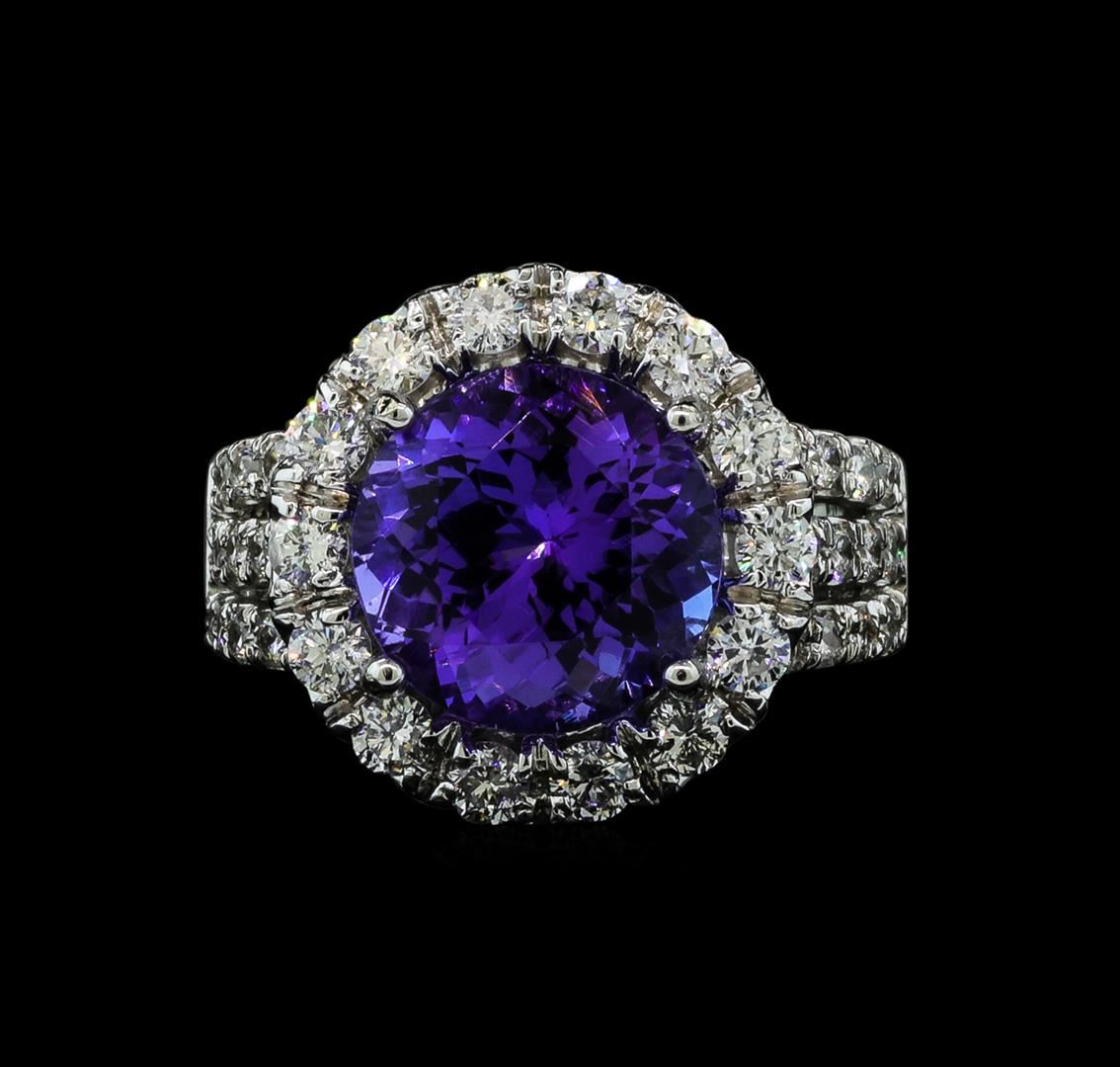 One electronically tested 14KT white gold lady's cast fashion ring with a three row split shank halo with a bright polish finish. The featured lady's ring has a shank measuring 3.84 millimeters wide. Identified with markings of '14K'. Condition is new, good workmanship. Containing: One prong set round modified brilliant cut natural tanzanite, measuring 10.62 - 10.57 x 7.02 mm, (depth est.) approximate weight of 5.26ct., clarity is eye clean, medium dark, moderately strong, bluish violet color, (GIA bV 6/4), cut is very good. Transmitting light with no distortion, transparent. Colored gemstones are presumed to have been subjected to commonly used enhancement processes. Graded in the setting. Fourteen prong set round brilliant cut diamonds, measuring 2.50 - 2.45 x 1.54mm (depth est.) approximate total weight of 14 Stones = 0.80ct. Graded in the setting. Clarity SI-1 to SI-2. Color: H - I Cut Good Forty-Two prong set round brilliant cut diamonds, measuring 1.70 - 1.60 x 1.02mm (depth est.) approximate total weight of 42 Stones = 0.72ct. Graded in the setting. Clarity SI-1 to I-1. Color: G - I Cut Good. Total Weight of Colored Stones 5.26ct.. Total Weight of Diamonds 1.52ct.. Total Weight of Ring 10.40gm GAS Appraised at $12,065.00.