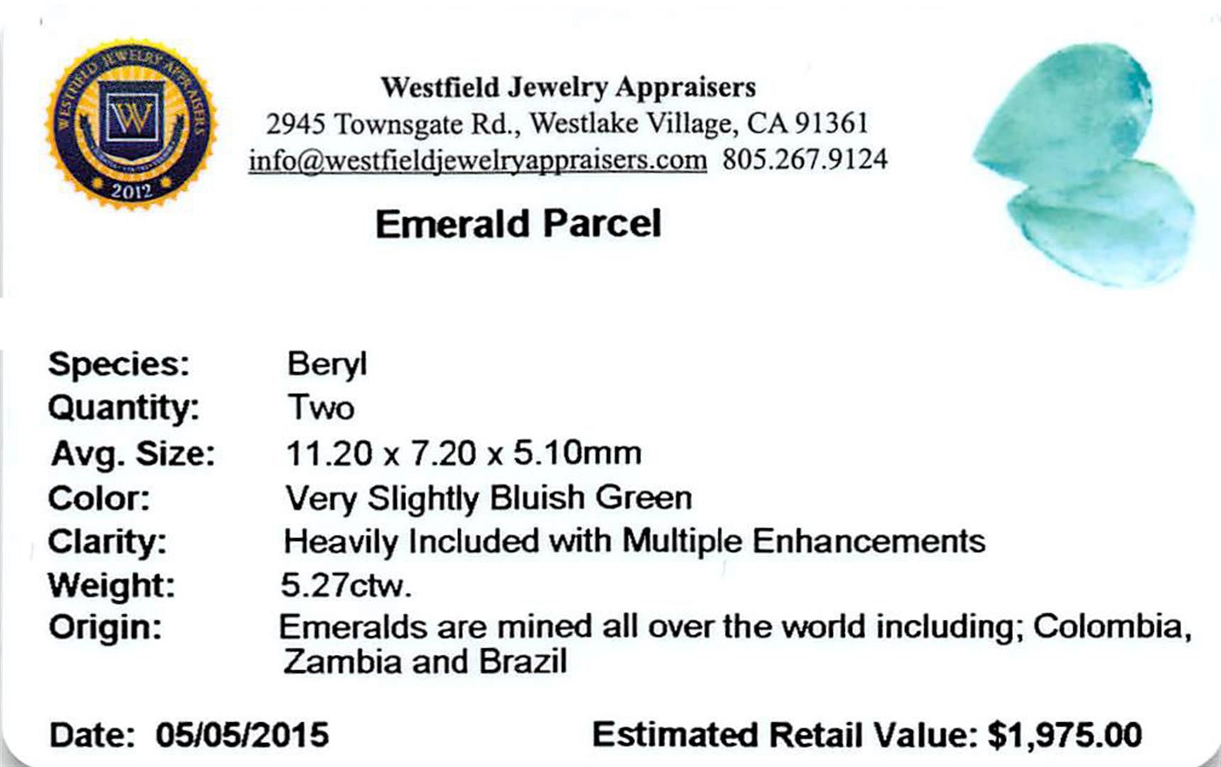 Two pear cut natural emeralds, measuring 11.20 x 7.20 x 5.10mm, exact total weight 5.27ct., clarity is moderately included, type III, medium light, very slightly grayish, very slightly bluish green color, (GIA vslbG 4/3) Westfield Appraised at $1,975.00.