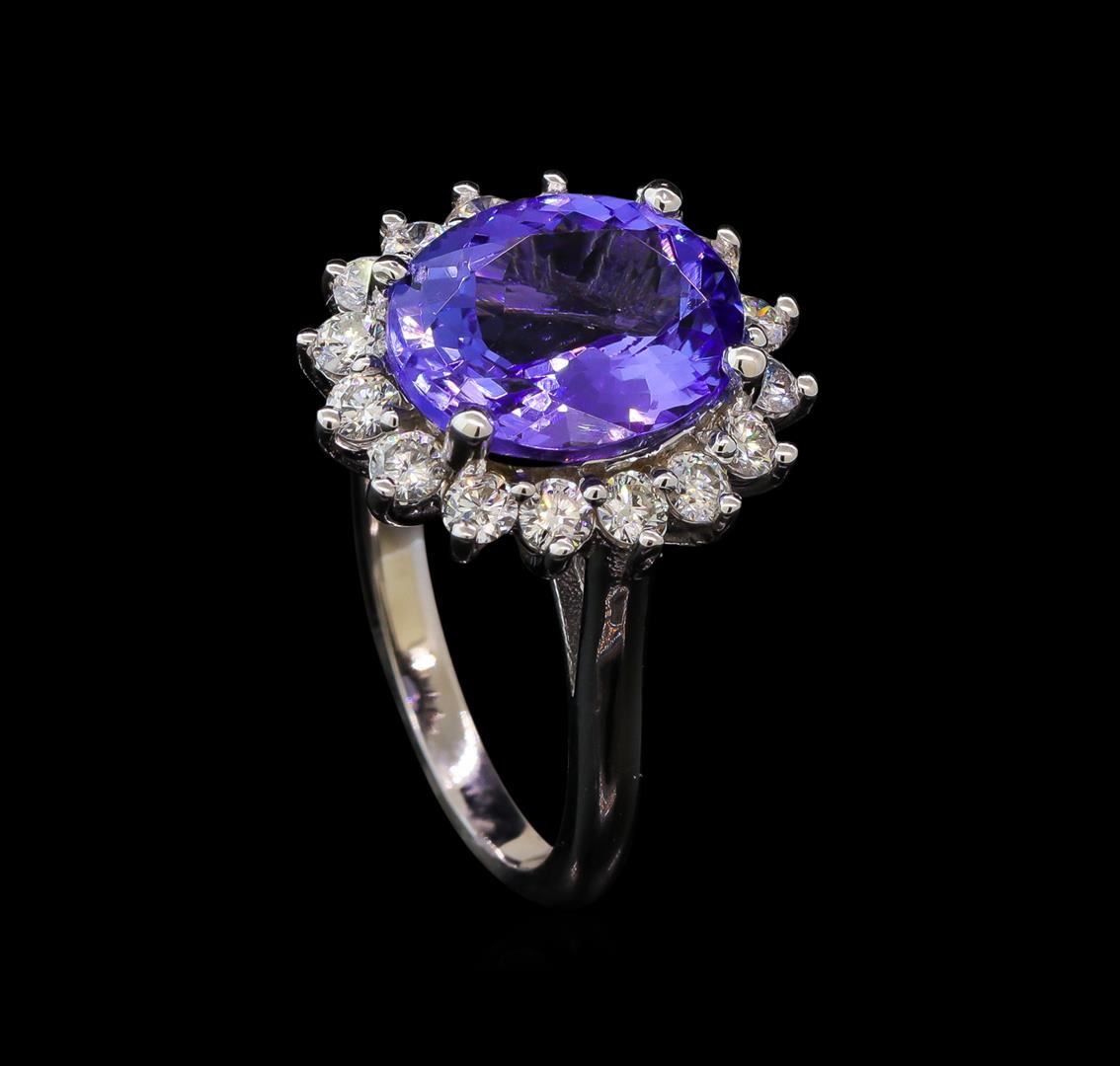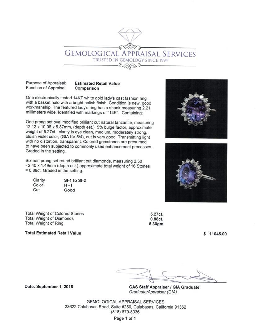 One electronically tested 14KT white gold lady's cast fashion ring with a basket halo with a bright polish finish. The featured lady's ring has a shank measuring 2.21 millimeters wide. Identified with markings of '14K'. Condition is new, good workmanship. Containing: One prong set oval modified brilliant cut natural tanzanite, measuring 12.12 x 10.06 x 5.87mm, (depth est.) 5%. bulge factor, approximate weight of 5.27ct., clarity is eye clean, medium, moderately strong, bluish violet color, (GIA bV 5/4), cut is very good. Transmitting light with no distortion, transparent. Colored gemstones are presumed to have been subjected to commonly used enhancement processes. Graded in the setting. Sixteen prong set round brilliant cut diamonds, measuring 2.50 - 2.40 x 1.49mm (depth est.) approximate total weight of 16 Stones = 0.88ct. Graded in the setting. Clarity SI-1 to SI-2. Color: H - I Cut Good. Total Weight of Colored Stones 5.27ct.. Total Weight of Diamonds 0.88ct.. Total Weight of Ring 6.30gm GAS Appraised at $11,045.00.