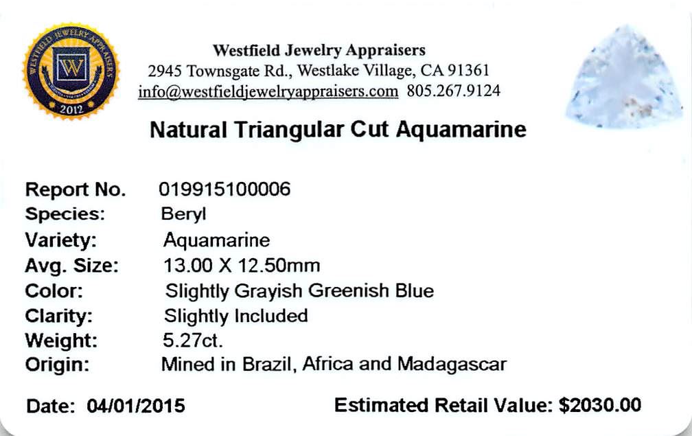 One triangle cut natural aquamarine exact weight 5.27ct., clarity is slightly included, type I, medium, slightly grayish, very slightly greenish blue color, (GIA vslgB 5/2), cut is good. Westfield Appraised at $2,030.00.
