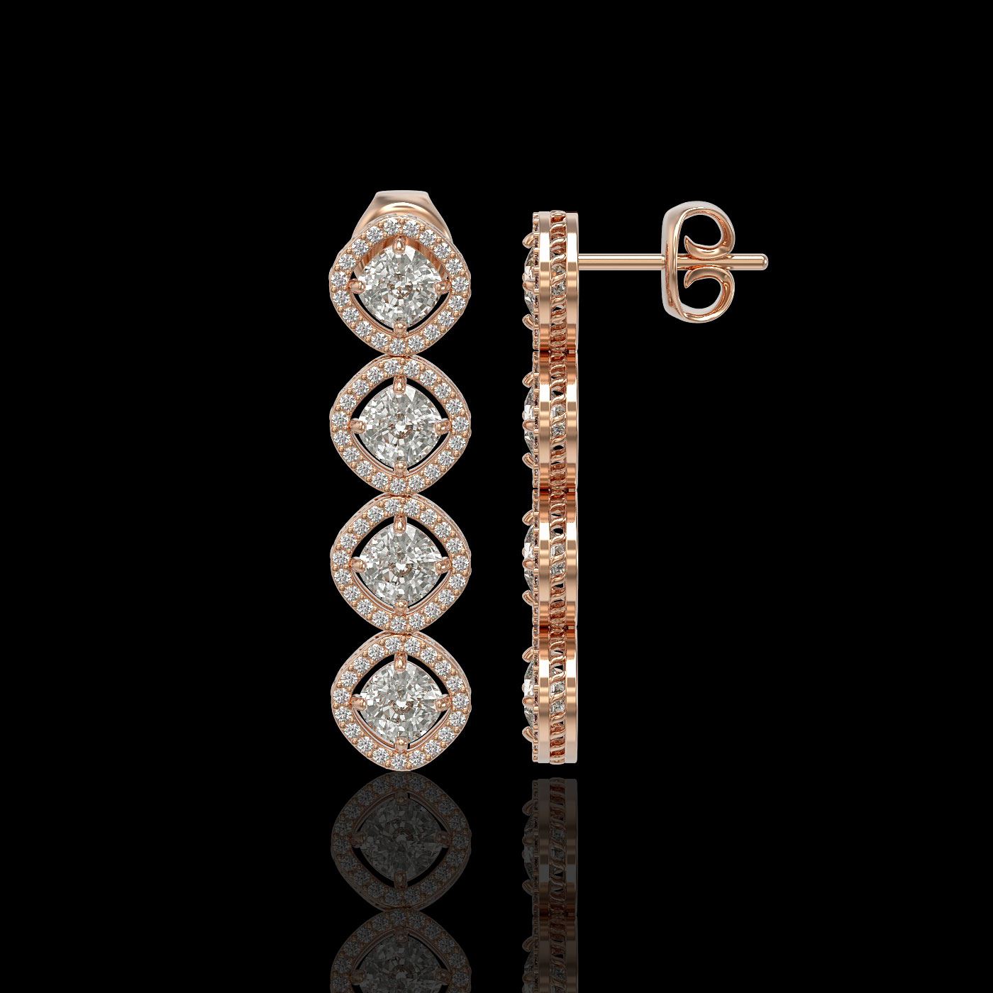 REF-981W6F -42810 ---- 5.28 CTW Cushion Cut Diamond Designer Earrings 18K Rose Gold ---- Luxury Designer Brand Earring Appraised at $43,200 Certificate Number US42810 18K Rose gold, Earring Size is 1 1/3 Inches Long, Earring measuring approx. 8 x 35 mm, weighing in total approx. 8 grams. Made in the USA and is stamped 18K, Main stone 4.07 carat total weight containing 8 pieces of I-J color with VS/SI quality Cushion shape cut Diamond , Stone #2 1.21 carat total weight containing 152 pieces of G-H color with VS/SI quality Round shape cut Diamond