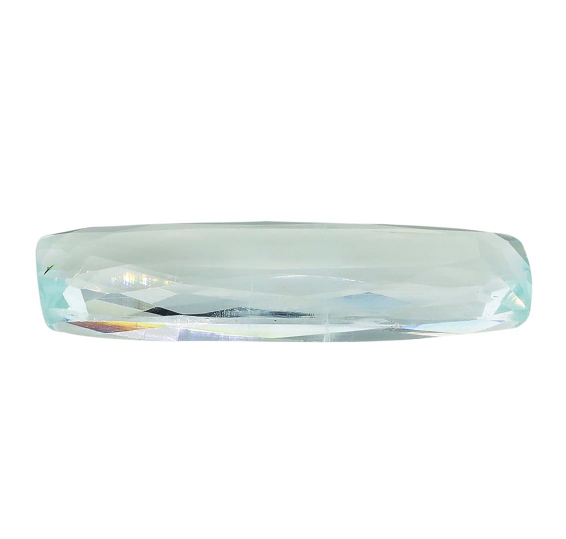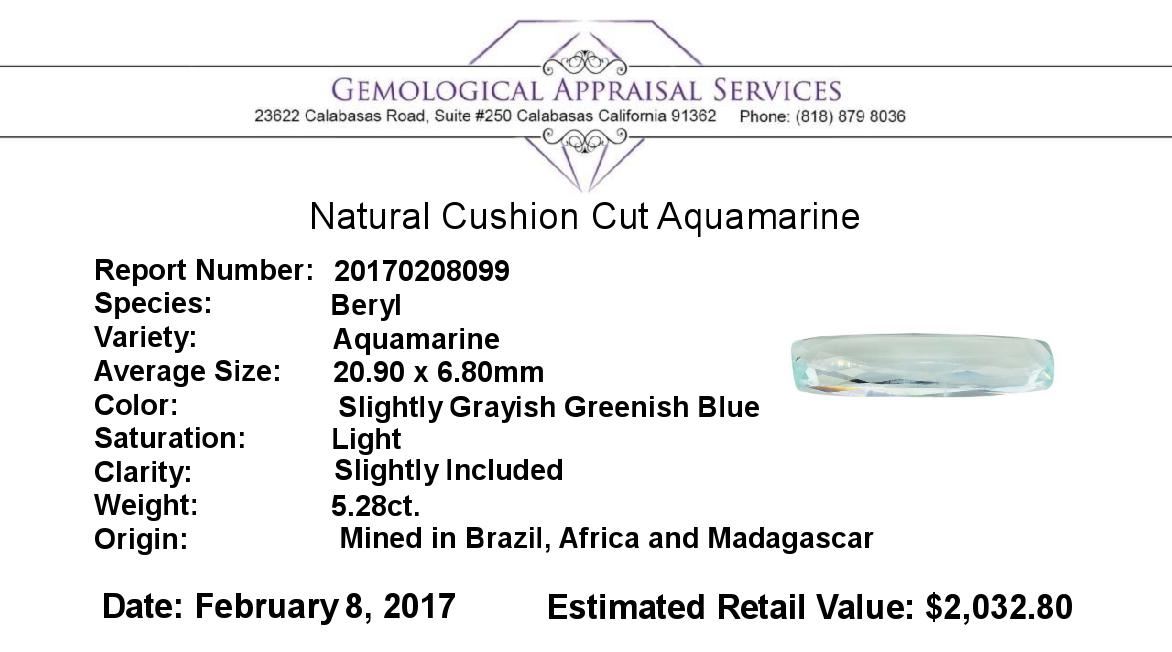 One natural cushion cut aquamarine with an exact weight of 5.28ct., clarity is slightly included, slightly grayish greenish blue, light. Gemological Appraisals Services estimates the retail value at $2032.8 GAS Appraised.