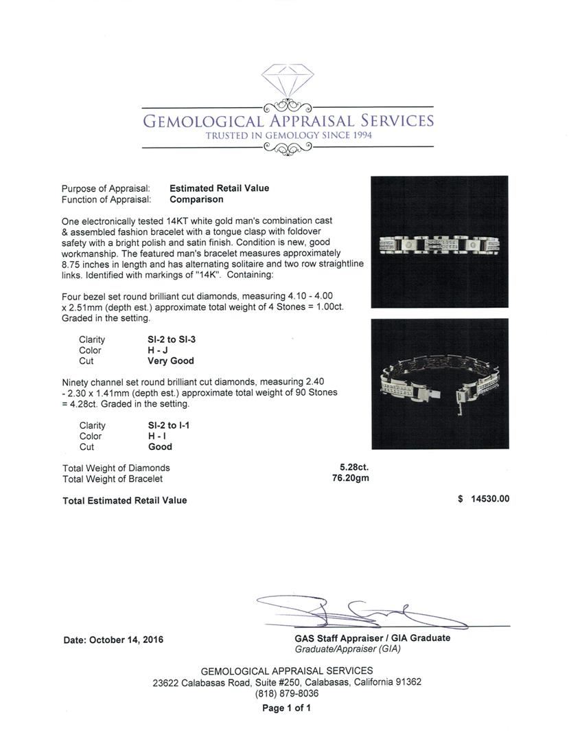 One electronically tested 14KT white gold man's combination cast & assembled fashion bracelet with a tongue clasp with foldover safety with a bright polish and satin finish. The featured man's bracelet measures approximately 8.75 inches in length and has alternating solitaire and two row straight line links. Identified with markings of '14K'. Condition is new, good workmanship. Containing: Four bezel set round brilliant cut diamonds, measuring 4.10 - 4.00 x 2.51mm (depth est.) approximate total weight of 4 Stones = 1.00ct. Graded in the setting. Clarity SI-2 to SI-3. Color: H - J Cut Very Good Ninety channel set round brilliant cut diamonds, measuring 2.40 - 2.30 x 1.41mm (depth est.) approximate total weight of 90 Stones = 4.28ct. Graded in the setting. Clarity SI-2 to I-1. Color: H - I Cut Good. Total Weight of Diamonds 5.28ct.. Total Weight of Bracelet 76.20gm. GAS Appraised at $14,530.00.