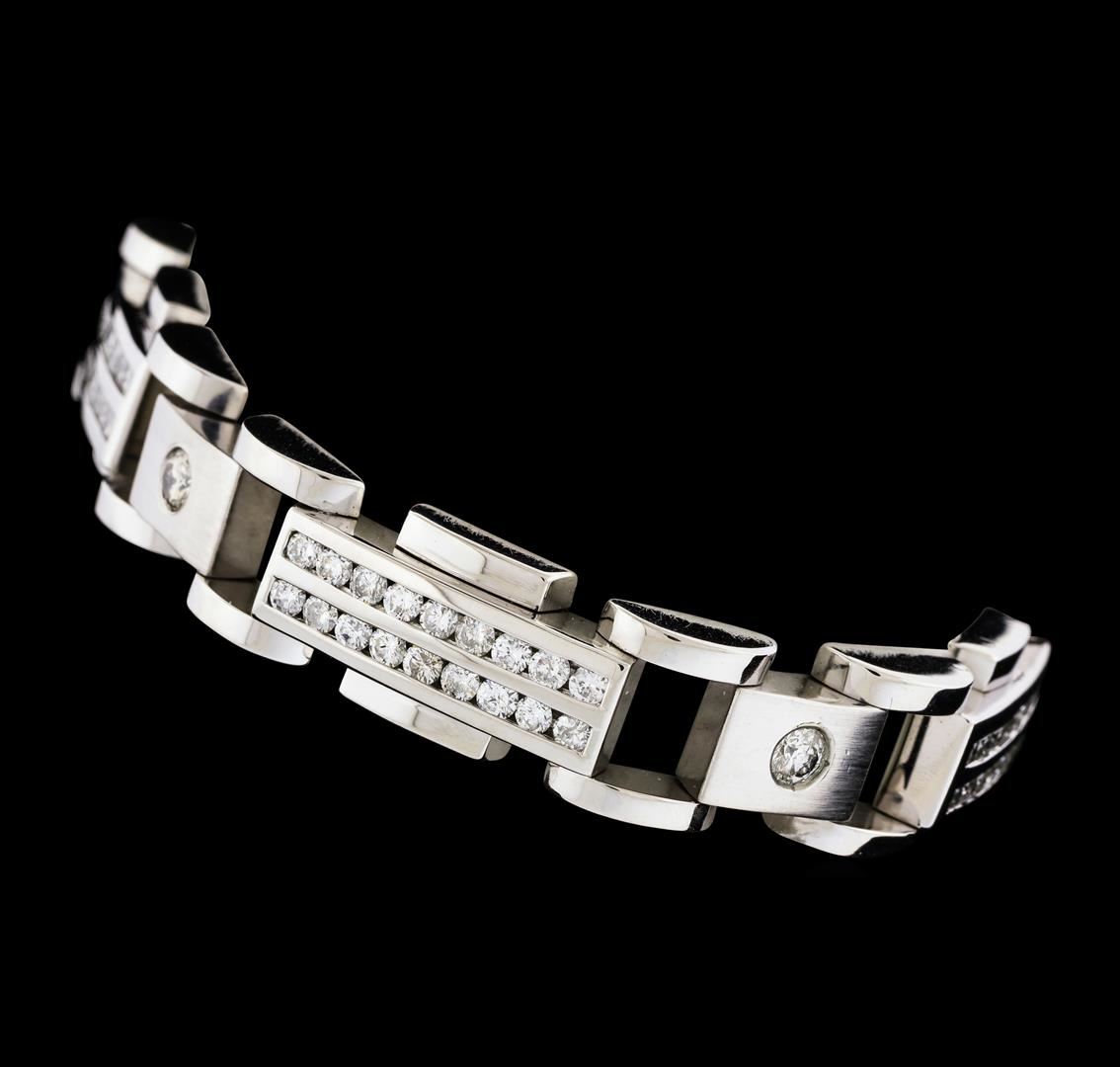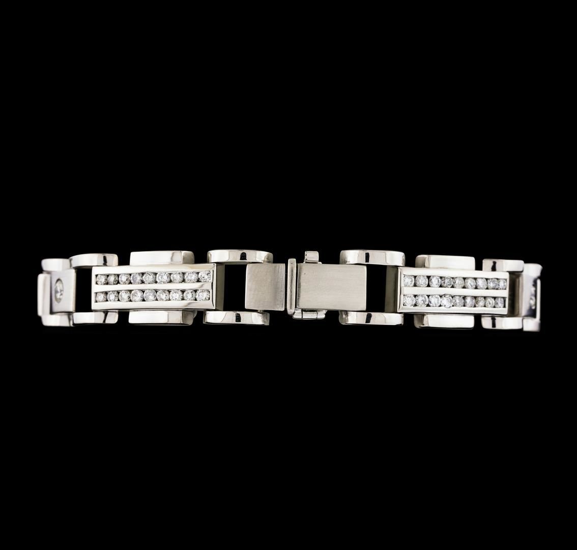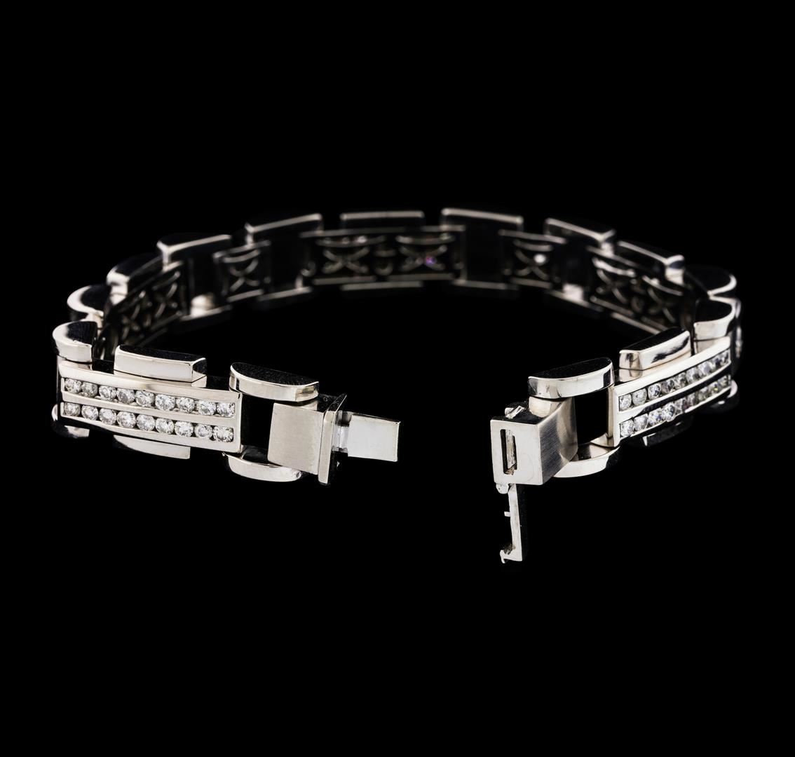 One electronically tested 14KT white gold man's combination cast & assembled fashion bracelet with a tongue clasp with foldover safety with a bright polish and satin finish. The featured man's bracelet measures approximately 8.75 inches in length and has alternating solitaire and two row straight line links. Identified with markings of '14K'. Condition is new, good workmanship. Containing: Four bezel set round brilliant cut diamonds, measuring 4.10 - 4.00 x 2.51mm (depth est.) approximate total weight of 4 Stones = 1.00ct. Graded in the setting. Clarity SI-2 to SI-3. Color: H - J Cut Very Good Ninety channel set round brilliant cut diamonds, measuring 2.40 - 2.30 x 1.41mm (depth est.) approximate total weight of 90 Stones = 4.28ct. Graded in the setting. Clarity SI-2 to I-1. Color: H - I Cut Good. Total Weight of Diamonds 5.28ct.. Total Weight of Bracelet 76.20gm. GAS Appraised at $14,530.00.