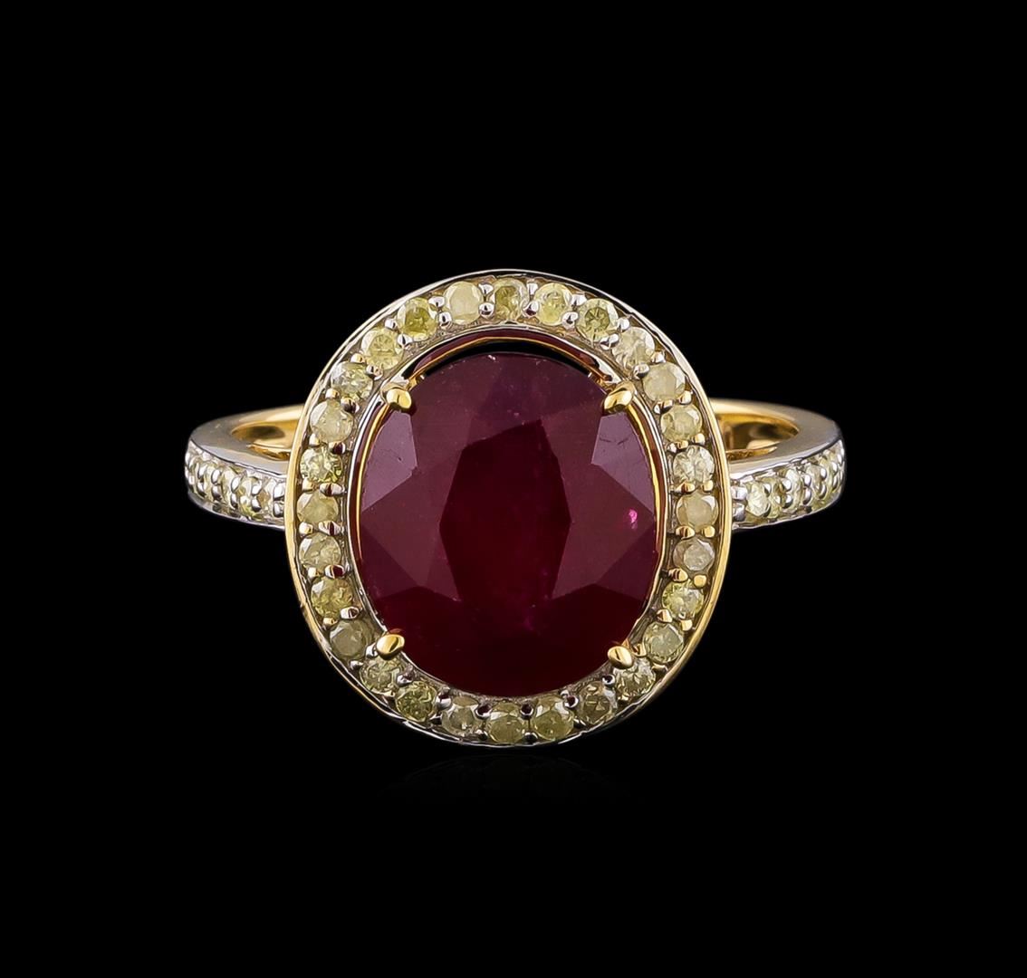 One electronically tested 14KT yellow gold ladies cast ruby and diamond ring. The featured ruby is set within a diamond bezel supported by diamond ribbon shoulders, completed by a two millimeter wide band. Bright polish finish with rhodium accents. Trademark is Orianne. Identified with markings of "14K". Condition is new, good workmanship. Containing: One prong set oval mixed cut natural ruby approximate weight of 5.28ct., clarity is heavily included, type II, medium dark, very slightly brownish, slightly purplish red color, (GIA slpR 6/3), cut is good. Transmitting light somewhat diffusely, transparent to translucent. Naturally occurring internal & external characteristics are present. Indications of laboratory high temperature heat treatment, with glass & flux additives. Graded in the setting. Ruby has a low tolerance to rhodium plating, repolishing the surface, & ultrasonic cleaning. Forty-Two prong set round brilliant cut diamonds approximate total weight of 42 Stones = 0.43ct. The group is composed of a mix of natural very light yellow and light yellow color diamonds. Graded in the setting. Clarity: I-1 to I-3. Total Weight of Colored Stones 5.28ct. Total Weight of Diamonds 0.43ct. Total Weight of Ring 4.64gm. AIG Appraised at $2,400.00.