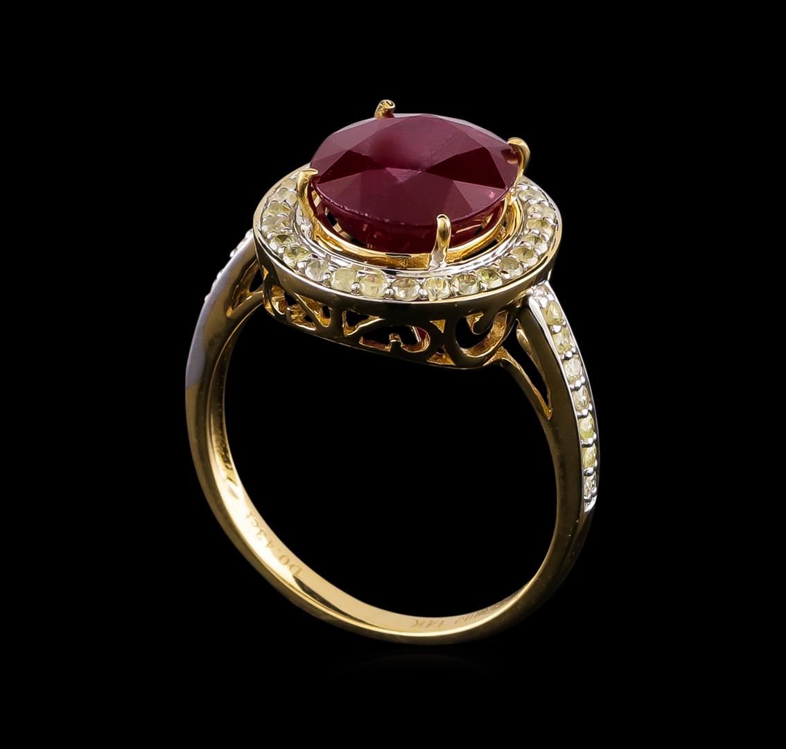 One electronically tested 14KT yellow gold ladies cast ruby and diamond ring. The featured ruby is set within a diamond bezel supported by diamond ribbon shoulders, completed by a two millimeter wide band. Bright polish finish with rhodium accents. Trademark is Orianne. Identified with markings of "14K". Condition is new, good workmanship. Containing: One prong set oval mixed cut natural ruby approximate weight of 5.28ct., clarity is heavily included, type II, medium dark, very slightly brownish, slightly purplish red color, (GIA slpR 6/3), cut is good. Transmitting light somewhat diffusely, transparent to translucent. Naturally occurring internal & external characteristics are present. Indications of laboratory high temperature heat treatment, with glass & flux additives. Graded in the setting. Ruby has a low tolerance to rhodium plating, repolishing the surface, & ultrasonic cleaning. Forty-Two prong set round brilliant cut diamonds approximate total weight of 42 Stones = 0.43ct. The group is composed of a mix of natural very light yellow and light yellow color diamonds. Graded in the setting. Clarity: I-1 to I-3. Total Weight of Colored Stones 5.28ct. Total Weight of Diamonds 0.43ct. Total Weight of Ring 4.64gm. AIG Appraised at $2,400.00.
