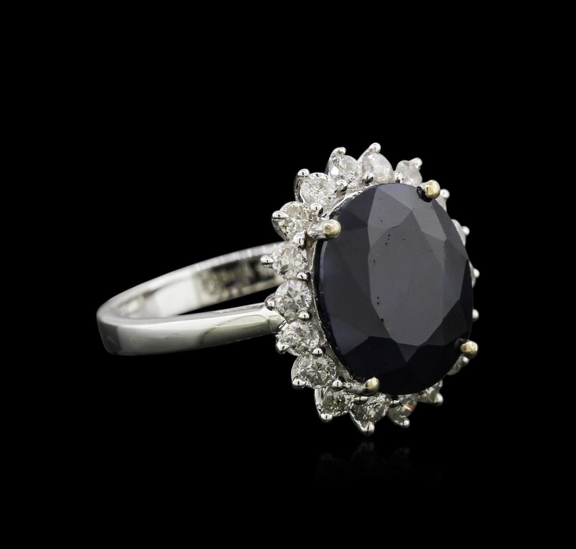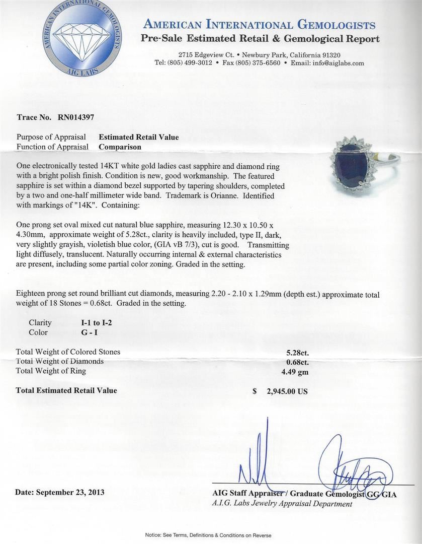 One electronically tested white gold ladies cast sapphire and diamond ring with a bright polish finish. Condition is new, good workmanship. The featured sapphire is set within a diamond bezel supported by tapering shoulders, completed by a two and one-half millimeter wide band. Trademark is Orianne. Identified with markings of" 14K".Containing:One prong set oval mixed cut natural blue sapphire, measuring 12.30 x 10.50 x 4.30mm, approximate weight of5.28ct., clarity is heavily included, type II, dark, very slightly grayish, violetish blue color, (GIA vB 7/3), cut is good. Transmitting light diffusely, translucent. Naturally occurring internal & external characteristics are present, including some partial color zoning. Graded in the setting. Eighteen prong set round brilliant cut diamonds, measuring 2.20 - 2.10 x 1.29mm (depth est.) approximate total weight of 18 Stones = 0.68ct. Graded in the setting. Clarity: 1-1 to 1-2.Color: G - I. AIG Appraised at $2,945.00.