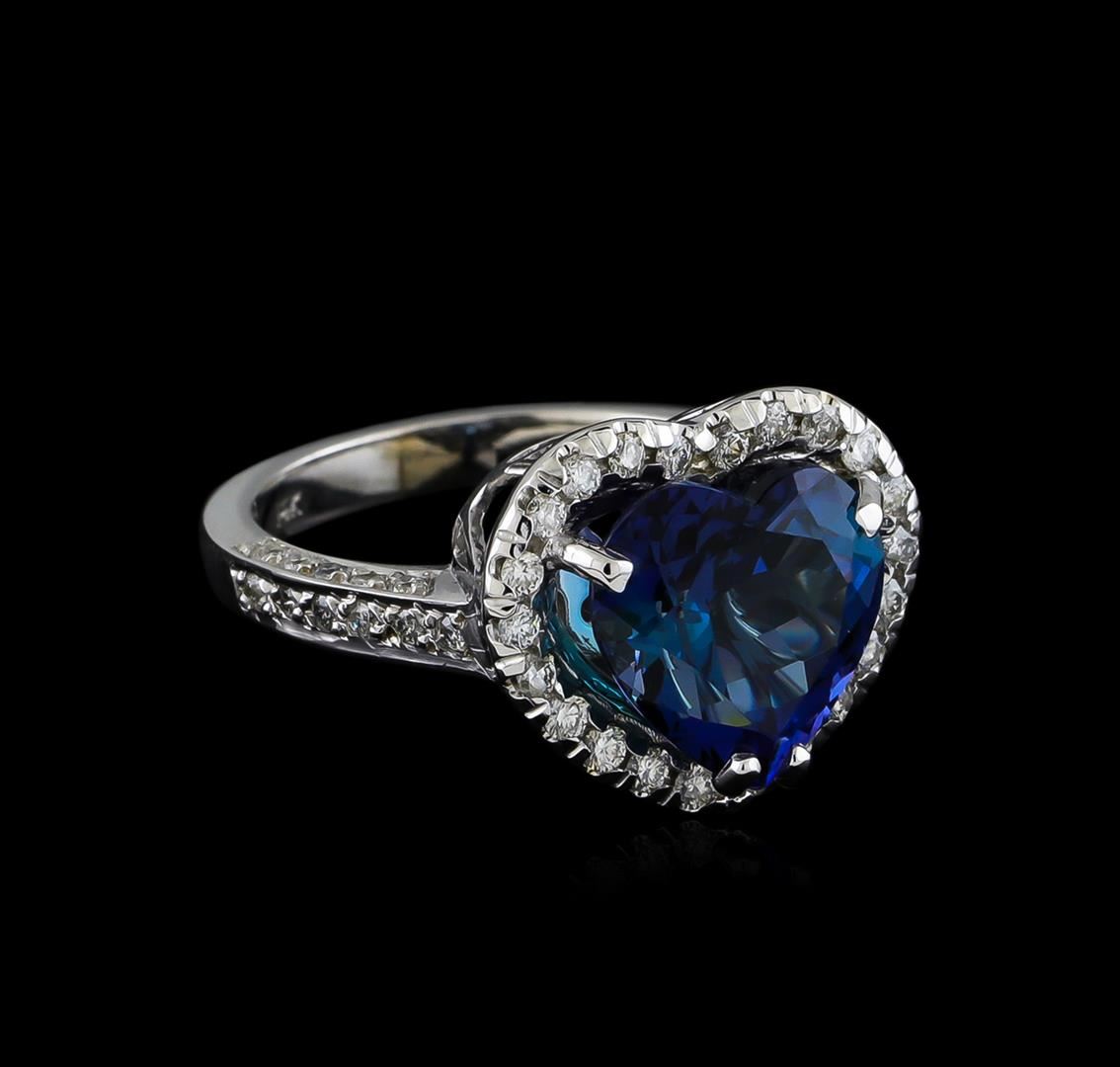 One electronically tested 14KT white gold ladies cast tanzanite and diamond ring with a bright polish finish. The featured tanzanite is set within a diamond bezel supported by an elaborate lattice under gallery and diamond set shoulders, completed by a two millimeter wide band. Identified with markings of "14K". Condition is new, good workmanship. Containing: One prong set heart mixed cut natural tanzanite, measuring 10.00 x 10.50 x 7.70mm, approximate weight of 5.28ct., clarity is eye clean, type I, dark, moderately strong, violetish blue color, (GIA vB 7/4), cut is good. Transmitting light with no distortion, transparent. Colored Stone Grading Report attached. Graded in the setting. Tanzanite is a very rare gemstone that is only found in the country of Tanzania. Originally discovered in 1967. Tiffany & Company, named the stone Tanzanite. It is found in the Usumburu Mountains that border the Umba Valley of northern Tanzania. Tanzanite occurs in gray, brown, violet, blue, reddish-purple, & green. The gem is interesting because of its exceptional pleochroism. Rotated in different directions a tanzanite will exhibit multiple changes of color. Tanzanite has a low tolerance to ultrasonic cleaning, and should not be cleaned using this method. Twenty-Two prong set round brilliant cut diamonds, measuring 1.50 - 1.50 x 0.90mm (depth est.) approximate total weight of 22 Stones = 0.27ct. Graded in the setting. Clarity: SI-2 to I-2. Color: G - I Thirty-Two prong set round brilliant cut diamonds, measuring 1.30 - 1.20 x 0.75mm (depth est.) approximate total weight of 32 Stones = 0.23ct. Graded in the setting. Clarity: SI-2 to I-2. Color: G - I. Total Weight of Colored Stones 5.28ct. Total Weight of Diamonds 0.50ct. Total Weight of Ring 5.14gm. AIG Appraised at $14,010.00.