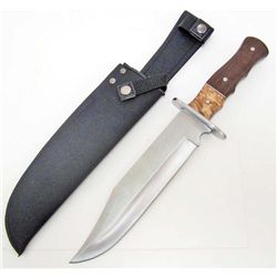 13 3/4" overall. 8 1/2" satin finish stainless clip point bowie blade. Full tang. Two tone burlwood handles. Stainless guard. Black nylon ...