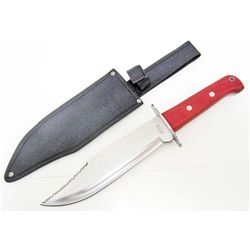 14 1/4" overall. 9 1/4" 440 stainless bowie blade. Full tang. Red wood handles with black wood trim and stainless spacer stripe. Stainless...