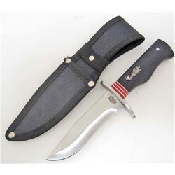 13 7/8" overall. 9" 440 stainless bowie blade. Black wood handles with nickel silver spacer stripes. Full tang. Stainless guard. Lanyard h...