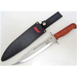 15" overall. 9 1/2" 440 stainless sawback blade. Full tang. Brown wood handles with stainless finger guard. Black nylon belt sheath