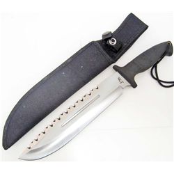 15" overall. 10" stainless sawback blade. Grooved black rubber handle with integrated guard. Black cord lanyard. Black nylon belt sheath.