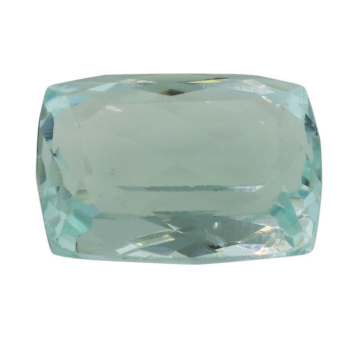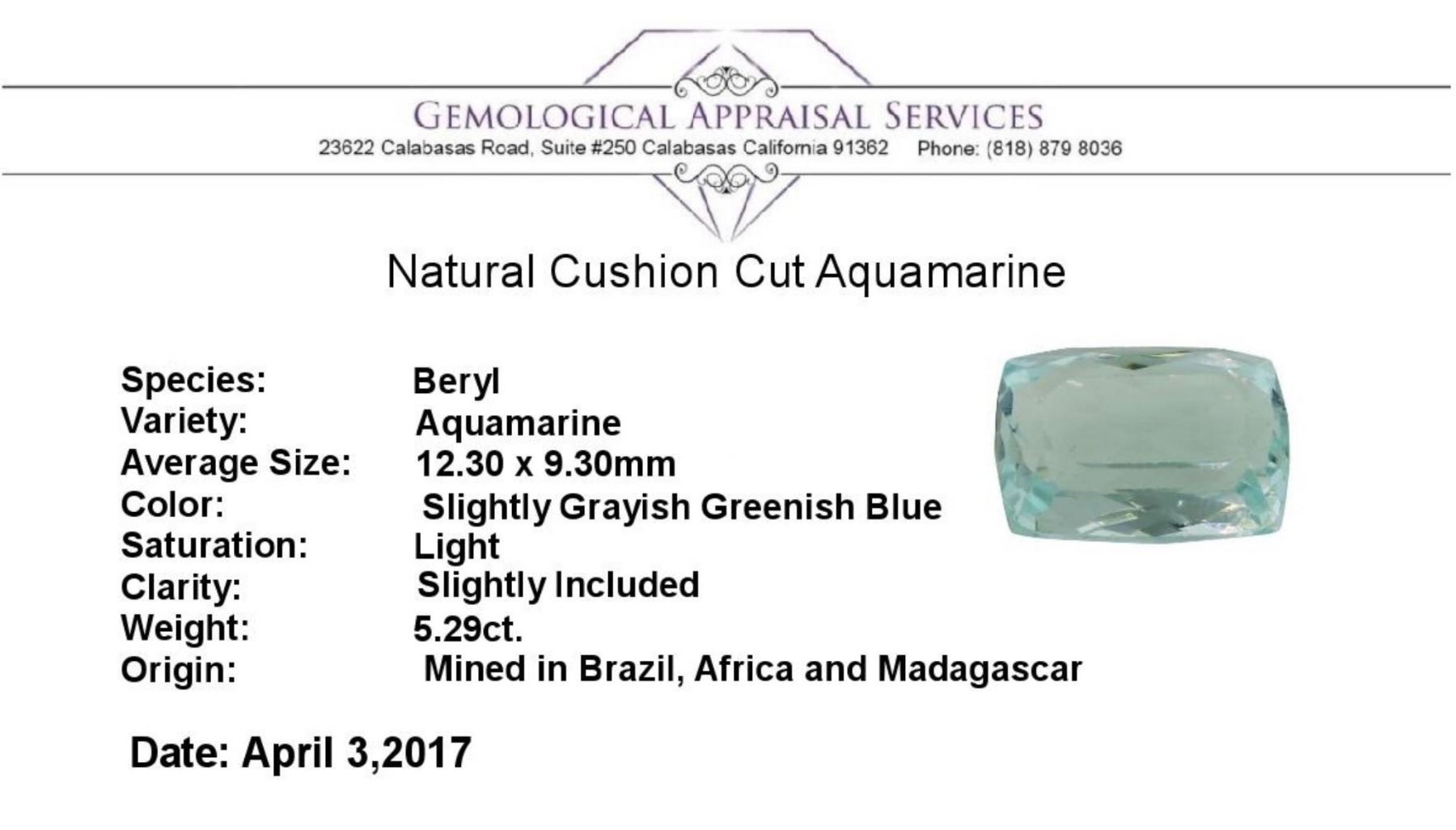 One natural cushion cut aquamarine with an exact weight of 5.29ct., clarity is slightly included, slightly grayish greenish blue, light. Gemological Appraisals Services estimates the retail value at $1507.65 GAS Appraised.