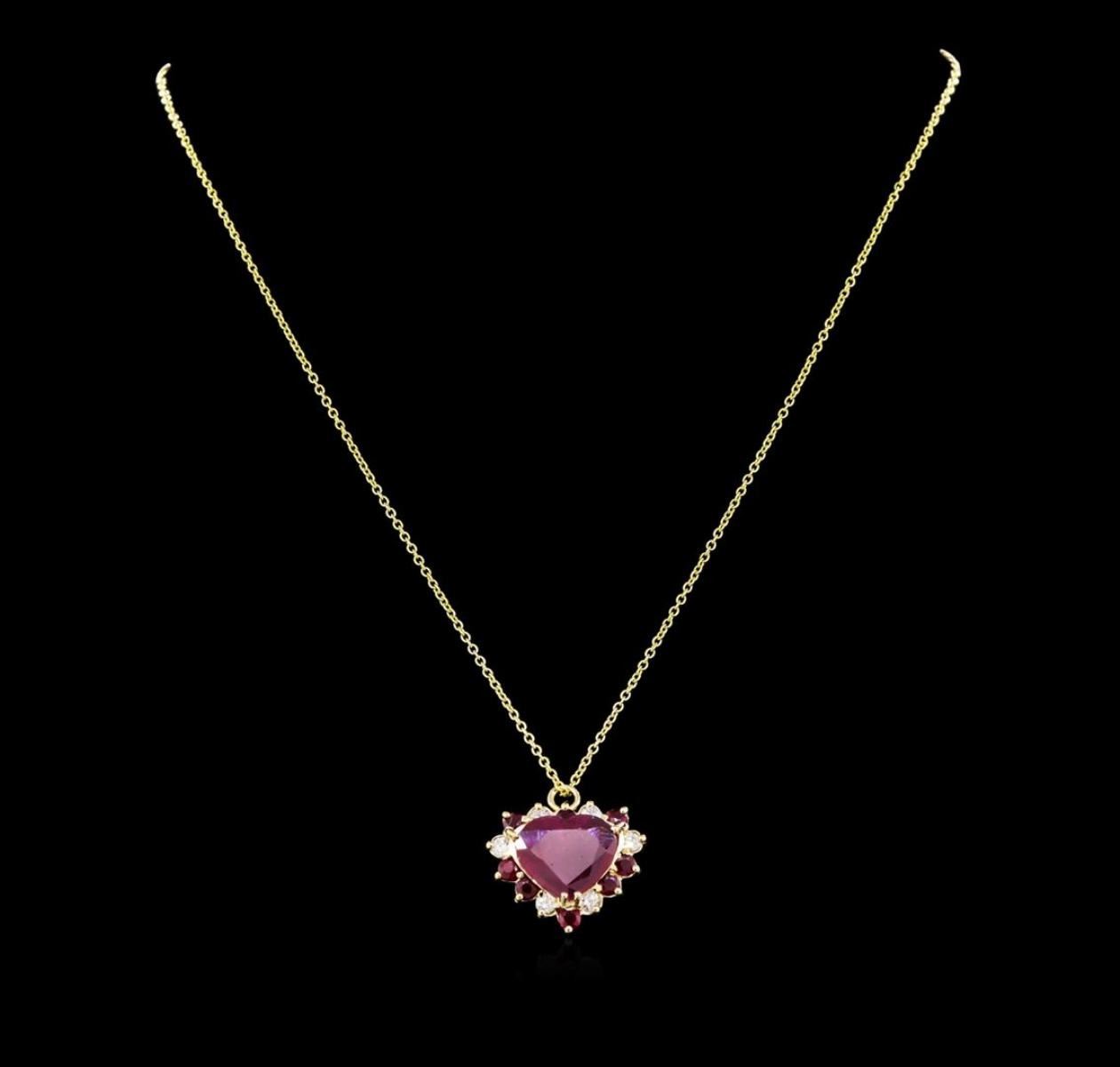One pendant featuring: 14KT yellow gold weighing 3.98 grams containing one ruby with a total weight of 4.01 and 8 rubies with a total weight of 1.28ct and side diamonds with a total weight of 0.50ct.