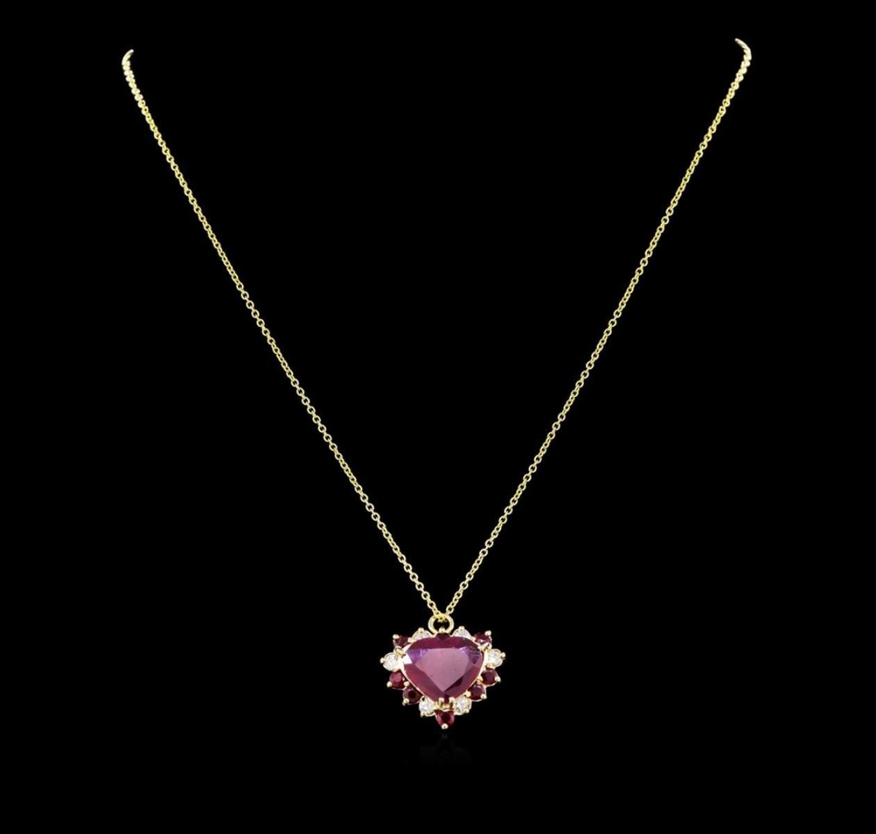 One pendant featuring: 14KT yellow gold weighing 3.98 grams containing one ruby with a total weight of 4.01 and 8 rubies with a total weight of 1.28ct and side diamonds with a total weight of 0.50 ct.