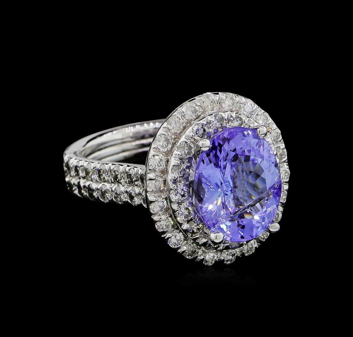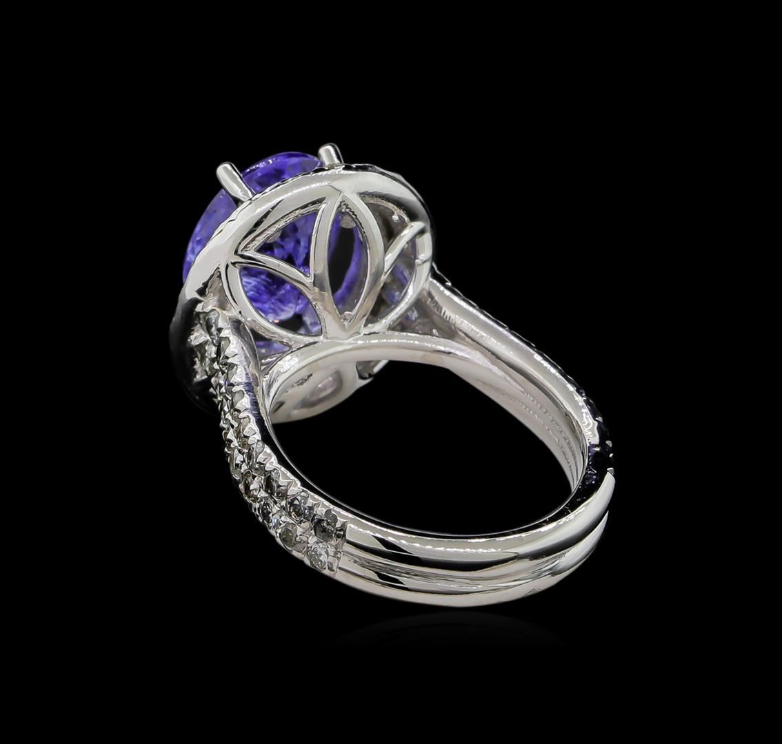 One electronically tested 14KT white gold ladies cast tanzanite & diamond ring with a bright finish. The featured tanzanite is set within tiered diamond bezels, supported by diamond set shoulders, completed by a four millimeter wide band. Identified with markings of "14K". Condition is new, good workmanship. Containing: One prong set oval mixed cut natural tanzanite, measuring 11.20 x 9.50 x 6.60mm, 7%. bulge factor, approximate weight of 5.29ct., clarity is heavily included, type I, medium light, very slightly grayish, bluish violet color, (GIA bV 4/3), cut is good. Transmitting light with some distortion. Internal & external characteristics are present, including a large surface feather. Colored Stone Grading Report attached. Graded in the setting. Tanzanite is a very rare gemstone that is only found in the country of Tanzania. Originally discovered in 1967. Tiffany & Company, named the stone Tanzanite. It is found in the Usumburu Mountains that border the Umba Valley of northern Tanzania. Tanzanite occurs in gray, brown, violet, blue, reddish-purple, & green. The gem is interesting because of its exceptional pleochroism. Rotated in different directions a tanzanite will exhibit multiple changes of color. Tanzanite has a low tolerance to ultrasonic cleaning, and should not be cleaned using this method. Seventy-Four prong set round brilliant cut diamonds, measuring 1.95 - 1.80 x 1.15mm (depth est.) approximate total weight of 74 Stones = 1.82ct. Graded in the setting. Clarity: SI-2 to I-2. Color: G - I. Total Weight of Colored Stones 5.29ct. Total Weight of Diamonds 1.82ct. Total Weight of Ring 8.76gm. AIG Appraised at $8,275.00.