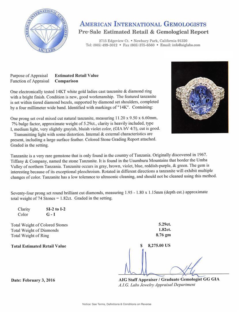 One electronically tested 14KT white gold ladies cast tanzanite & diamond ring with a bright finish. The featured tanzanite is set within tiered diamond bezels, supported by diamond set shoulders, completed by a four millimeter wide band. Identified with markings of "14K". Condition is new, good workmanship. Containing: One prong set oval mixed cut natural tanzanite, measuring 11.20 x 9.50 x 6.60mm, 7%. bulge factor, approximate weight of 5.29ct., clarity is heavily included, type I, medium light, very slightly grayish, bluish violet color, (GIA bV 4/3), cut is good. Transmitting light with some distortion. Internal & external characteristics are present, including a large surface feather. Colored Stone Grading Report attached. Graded in the setting. Tanzanite is a very rare gemstone that is only found in the country of Tanzania. Originally discovered in 1967. Tiffany & Company, named the stone Tanzanite. It is found in the Usumburu Mountains that border the Umba Valley of northern Tanzania. Tanzanite occurs in gray, brown, violet, blue, reddish-purple, & green. The gem is interesting because of its exceptional pleochroism. Rotated in different directions a tanzanite will exhibit multiple changes of color. Tanzanite has a low tolerance to ultrasonic cleaning, and should not be cleaned using this method. Seventy-Four prong set round brilliant cut diamonds, measuring 1.95 - 1.80 x 1.15mm (depth est.) approximate total weight of 74 Stones = 1.82ct. Graded in the setting. Clarity: SI-2 to I-2. Color: G - I. Total Weight of Colored Stones 5.29ct. Total Weight of Diamonds 1.82ct. Total Weight of Ring 8.76gm. AIG Appraised at $8,275.00.