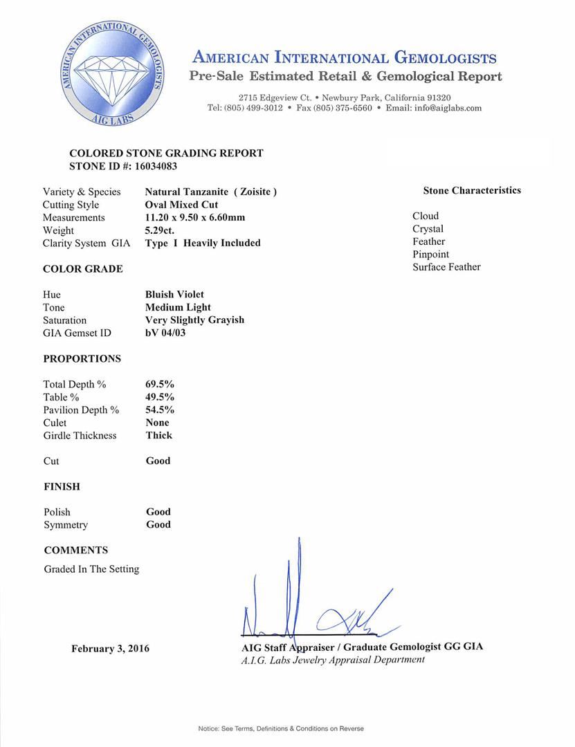 One electronically tested 14KT white gold ladies cast tanzanite & diamond ring with a bright finish. The featured tanzanite is set within tiered diamond bezels, supported by diamond set shoulders, completed by a four millimeter wide band. Identified with markings of "14K". Condition is new, good workmanship. Containing: One prong set oval mixed cut natural tanzanite, measuring 11.20 x 9.50 x 6.60mm, 7%. bulge factor, approximate weight of 5.29ct., clarity is heavily included, type I, medium light, very slightly grayish, bluish violet color, (GIA bV 4/3), cut is good. Transmitting light with some distortion. Internal & external characteristics are present, including a large surface feather. Colored Stone Grading Report attached. Graded in the setting. Tanzanite is a very rare gemstone that is only found in the country of Tanzania. Originally discovered in 1967. Tiffany & Company, named the stone Tanzanite. It is found in the Usumburu Mountains that border the Umba Valley of northern Tanzania. Tanzanite occurs in gray, brown, violet, blue, reddish-purple, & green. The gem is interesting because of its exceptional pleochroism. Rotated in different directions a tanzanite will exhibit multiple changes of color. Tanzanite has a low tolerance to ultrasonic cleaning, and should not be cleaned using this method. Seventy-Four prong set round brilliant cut diamonds, measuring 1.95 - 1.80 x 1.15mm (depth est.) approximate total weight of 74 Stones = 1.82ct. Graded in the setting. Clarity: SI-2 to I-2. Color: G - I. Total Weight of Colored Stones 5.29ct. Total Weight of Diamonds 1.82ct. Total Weight of Ring 8.76gm. AIG Appraised at $8,275.00.