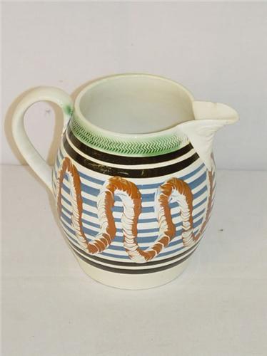 5 3/4" MOCHAWARE BARREL FORM PITCHER W/ TOOLED GREEN LEEDS TYPE TOP RIM BROWN & BLUE BANDS W/ RUST & WHITE EARTHWORM DECORATION - SMALL CHIPS TO SPOUT & SEVERAL SMALL HAIRLINES ON BASE