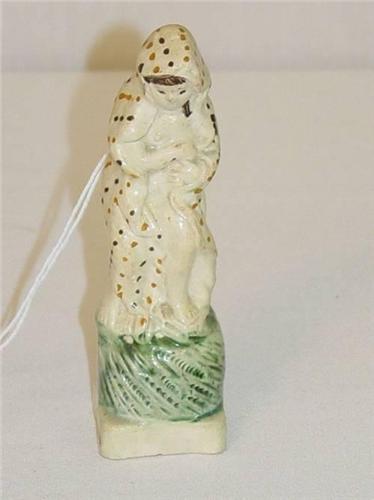 5 3/4" PRATTWARE FIGURE OF YOUNG LADY IN SPOTTED LONG COAT;