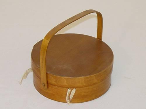 5 3/4" ROUND SEWING BOX W/ SWING HANDLE COMPLETE W/ LINER, PIN CUSHION, STRAWBERRY ETC. - MINOR WEAR & IMPERFECTIONS;