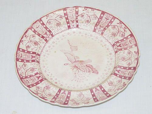 5 3/4" STAFFORDSHIRE RED TRANSFERWARE TODDY PLATE W/ AMERICAN EAGLE W/ U.S. FLAG E. PLURIBUS UNUM-NO MAKER - STAINS & SOME GLAZE WEAR