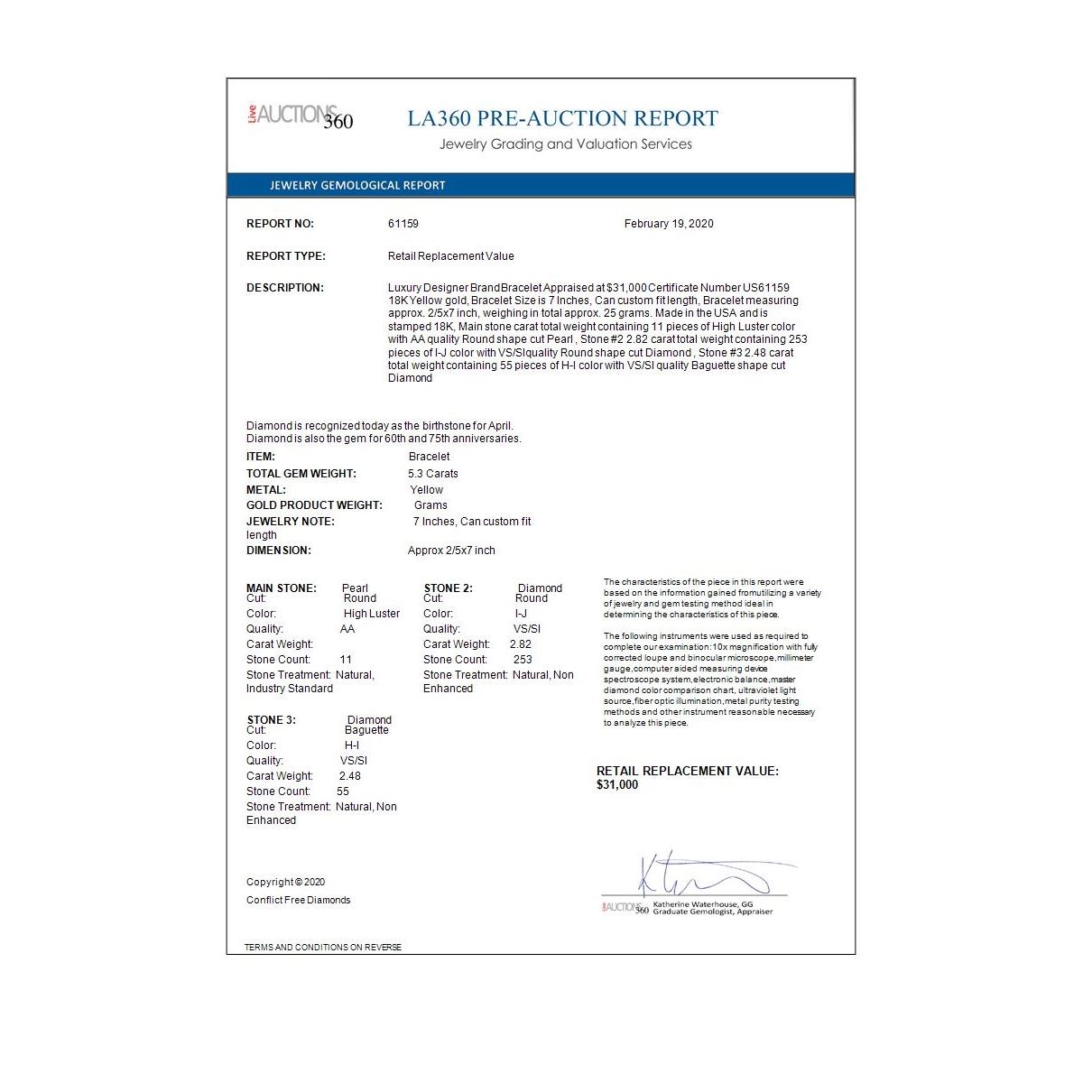REF-626K4Y - SKU: 61159 ---- 5.3 ctw Diamond & Pearl Bracelet 18K Yellow Gold