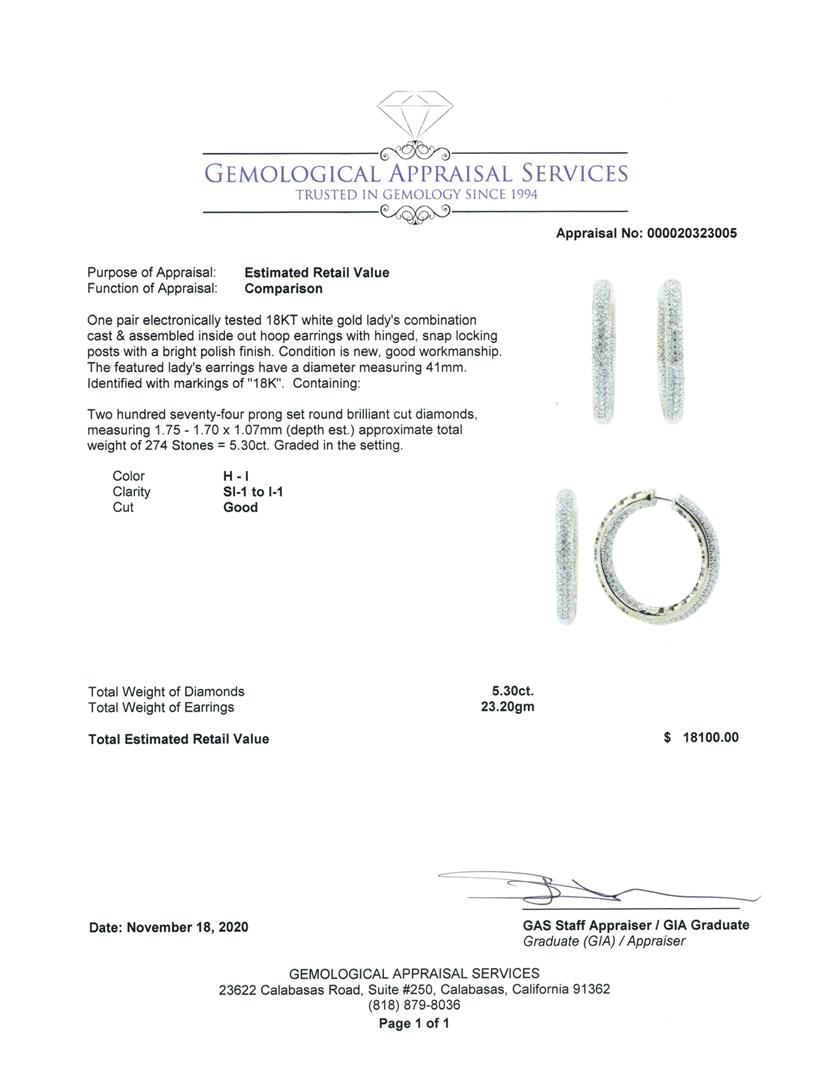 One pair electronically tested 18KT white gold lady's combination cast & assembled inside out hoop earrings with hinged, snap locking posts with a bright polish finish. Condition is new, good workmanship. The featured lady's earrings have a diameter measuring 41mm. Identified with markings of "18K". Containing: Two hundred seventy-four prong set round brilliant cut diamonds, measuring 1.75 - 1.70 x 1.07mm (depth est.) approximate total weight of 274 Stones = 5.30ct. Graded in the setting. Color H - | Clarity SI-1 to I-1 Cut Good Total Weight of Diamonds 5.30ct. Total Weight of Earrings 23.20gm Total Estimated Retail Value $ 18100.00