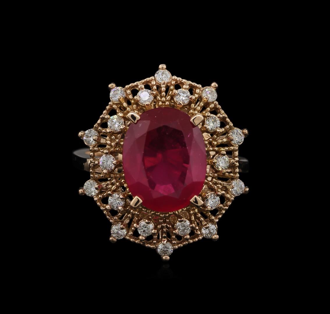 One ring featuring: 14KT rose gold weighing 5.80 grams containing one ruby center stone with a total weight of 5.30ct and 20 diamonds with a total weight of 0.46ct.