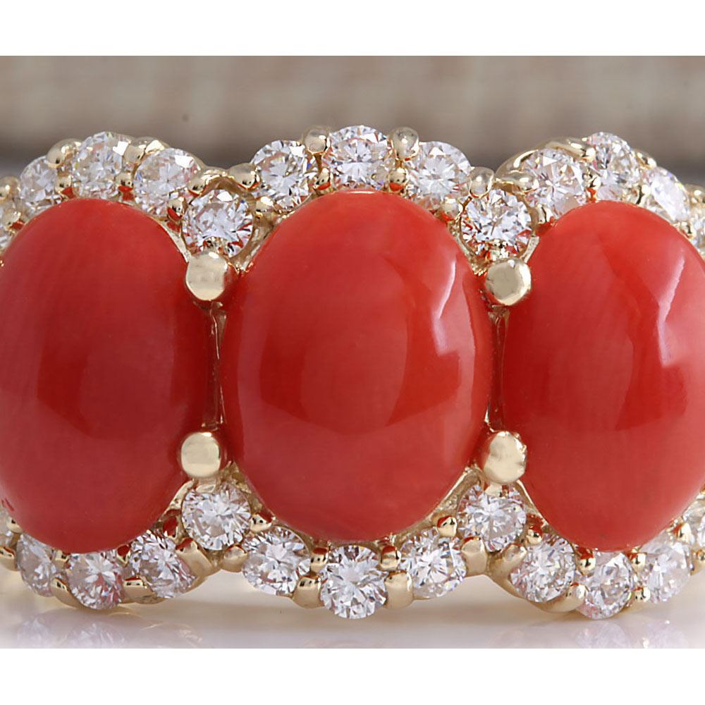5.30CTW Natural Red Coral And Diamond Ring 18K Solid Yellow Gold