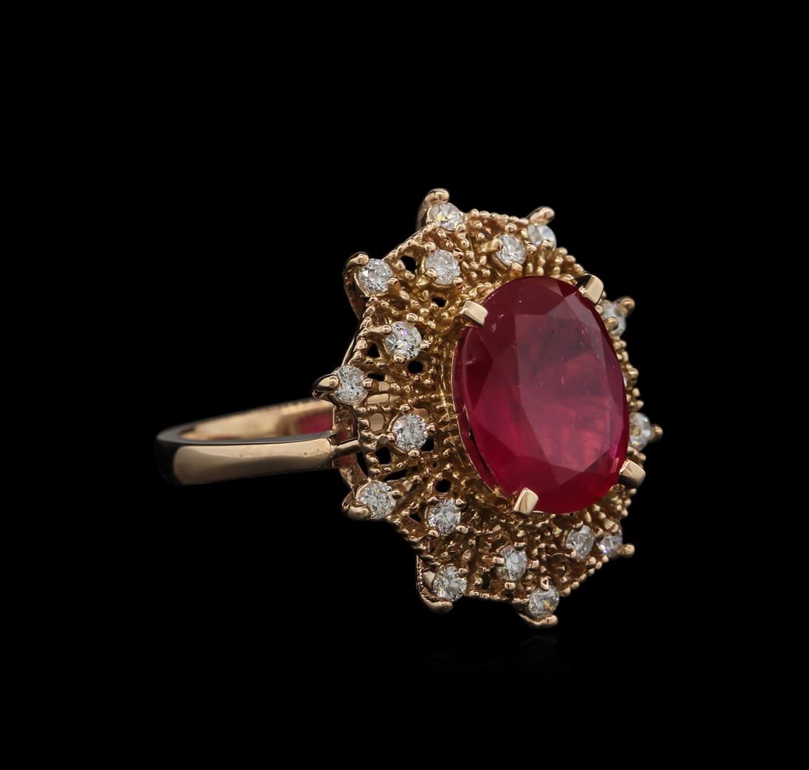 One ring featuring: 14KT rose gold weighing 5.80 grams containing one ruby center stone with a total weight of 5.30ct and 20 diamonds with a total weight of 0.46ct.