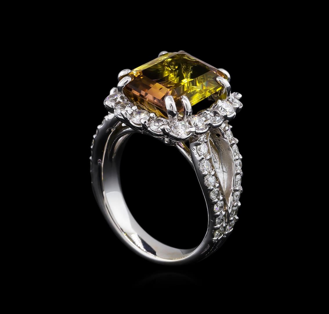 One electronically tested 14KT white gold lady's cast fashion ring with a split shank basket halo with a bright polish finish. The featured lady's ring has a double shank measuring 3.75 millimeters wide. Identified with markings of "14K". Condition is new, good workmanship. Containing: One prong set emerald step cut natural ametrine quartz, measuring 12.25 x 9.90 x 5.86mm, 4%. bulge factor, approximate weight of 5.31ct., clarity is eye clean, type I, medium, moderately strong, purple color, (GIA P 5/4) to medium dark, moderately strong, yellow, (GIA Y 6/4), cut is good. Transmitting light with no distortion, transparent. Colored gemstones are presumed to have been subjected to commonly used enhancement processes. Graded in the setting. Sixteen prong set round brilliant cut diamonds, measuring 2.35 - 2.25 x 1.43mm (depth est.) approximate total weight of 16 Stones = 0.75ct. Graded in the setting. Clarity: SI-1 to I-1. Color: G - Good Twenty-Eight prong set round brilliant cut diamonds, measuring 1.80 - 1.75 x 1.10mm (depth est.) approximate total weight of 28 Stones = 0.60ct. Graded in the setting. Clarity: SI-1 to SI-2. Color: G - I. Cut Good. Total Weight of Colored Stones 5.31ct. Total Weight of Diamonds 1.35ct. Total Weight of Ring 8.90gm GAS Appraised.