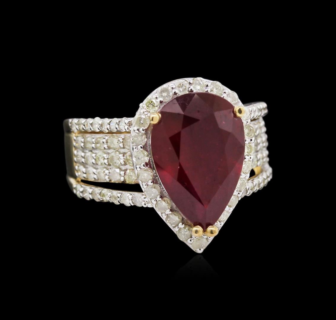 Fourteen karat (14K) yellow gold ruby and diamond ring. A pear cut ruby corundum gemstone is prong mounted in the center of the ring. Round brilliant cut diamonds accent the ring around the center gemstone and on both sides. The ring is cast stamped "14K" and has a gross weight of 7.6 Grams. Diamond(s): Shape: Round Brilliant Cut. Weight: 1.67 carat. Average Clarity: I1-I2. Average Color: H-J. Symmetry: Very Good. Polish: Very Good. GemStone(s): Ruby Corundum. Nature: Natural. Shape: Pear, Faceted. Quantity: 1. Weight: 5.31 carat total. Dimensions: Length- 13.89 mm. ; Width 9.01 mm. Bulge: Visible. Clarity: I1, Type 3. Color: Red (5/5). Symmetry: Very Good. Color Intensity: Medium. Transparency: Transparent. Tone: Dark. Enhancements: Indications of high temperature heat treatment, with glass and flux additives. Metal(s): Metal: Gold, Stamped. Purity: 14K. Color: Yellow. Condition: Excellent. Finish: High polish. GGA Appraised at $6,180.00.