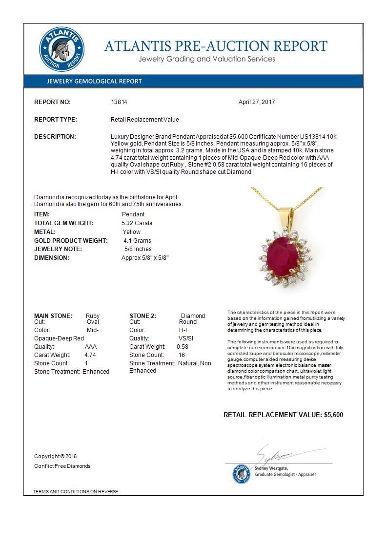 5.32 CTW Ruby & Diamond Pendant 10K Yellow Gold ---- Luxury Designer Brand Pendant Appraised Retail Price at $5,600 ---- SKU Number US13814 10k Yellow gold Pendant Size is 5/8 Inches, Pendant measuring approx. 5/8" x 5/8", weighing in total approx. 3.2 grams. Made in the USA and is stamped 10k, Main stone 4.74 carat total weight containing 1 pieces of Mid-Opaque-Deep Red color with AAA quality Oval shape cut Ruby , Stone #2 0.58 carat total weight containing 16 pieces of H-I color with VS/SI quality Round shape cut