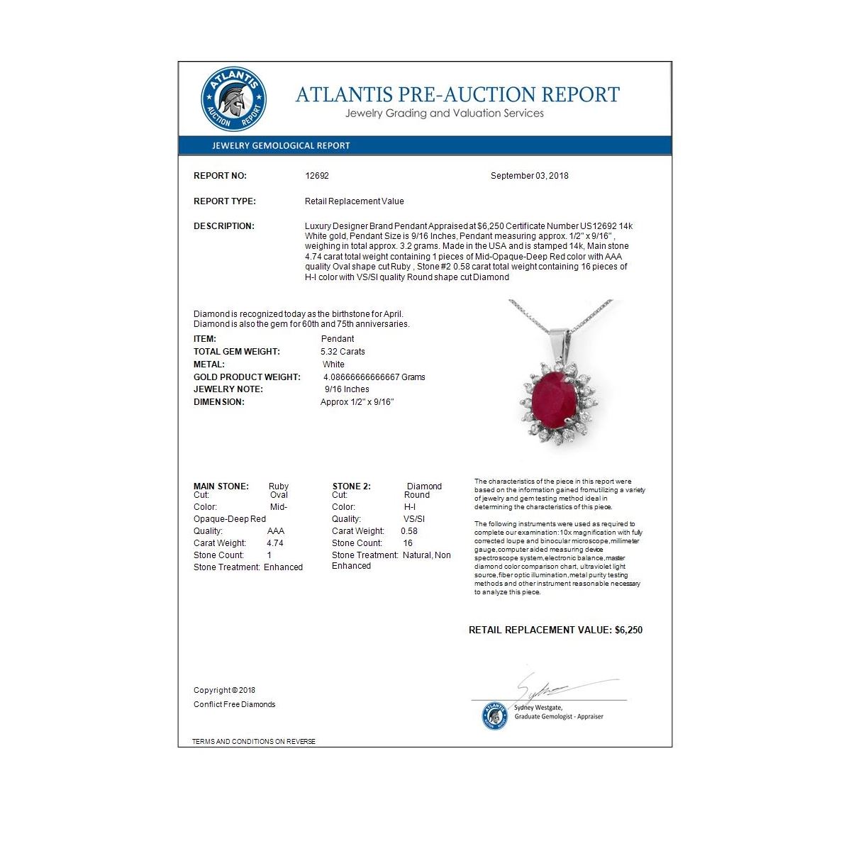 REF-87A3X -12692 ---- 5.32 CTW Ruby & Diamond Pendant 14K White Gold ---- Luxury Designer Brand Pendant Appraised at $6,250 Certificate Number US12692 14k White gold, Pendant Size is 9/16 Inches, Pendant measuring approx. 1/2" x 9/16" , weighing in total approx. 3.2 grams. Made in the USA and is stamped 14k, Main stone 4.74 carat total weight containing 1 pieces of Mid-Opaque-Deep Red color with AAA quality Oval shape cut Ruby , Stone #2 0.58 carat total weight containing 16 pieces of H-I color with VS/SI quality Round shape cut Diamond