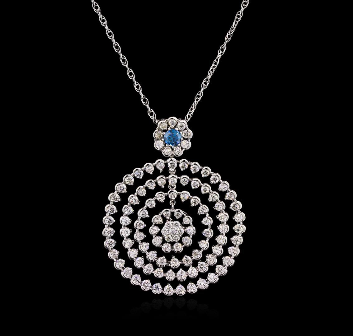One electronically tested 14KT white gold lady's combination cast & assembled fashion pendant & chain 18.0" long, 1.7mm diamond cut loose rope chain with a spring ring clasp with a bright polish finish. Identified with markings of "14K". Condition is new, good workmanship. Containing: One prong set round brilliant cut diamond, measuring 5.05 - 5.00 x 3.02mm (depth est.) approximate weight of 0.46ct. Colored gemstones are presumed to have been subjected to commonly used enhancement processes. Graded in the setting. Clarity: SI-1 Cut Very Good One Hundred Six prong set round brilliant cut diamonds, measuring 2.50 - 2.00 x 1.46mm (depth est.) approximate total weight of 106 Stones = 4.86ct. Graded in the setting. Clarity: SI-2 to I-1. Color: H - I. Cut Good. Total Weight of Diamonds 5.32ct. Total Weight of Pendant & Chain 15.50gm at $13255.00.. GAS Appraised at $13,255.00.