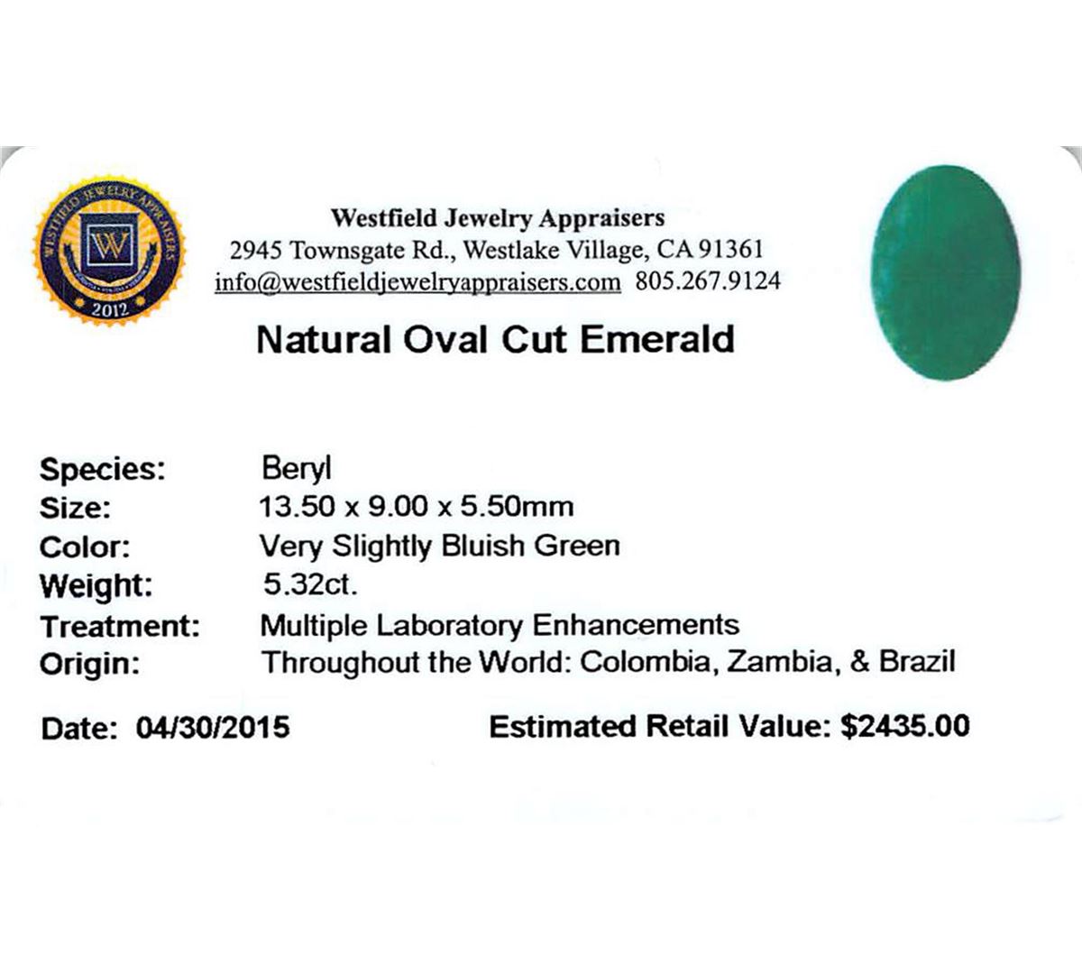 One oval mixed cut natural emerald exact weight 5.32ct., clarity is heavily included, type III, medium dark, very slightly grayish, very slightly bluish green color, (GIA vslbG 6/3), cut is good. Westfield Appraised at $2,435.00.