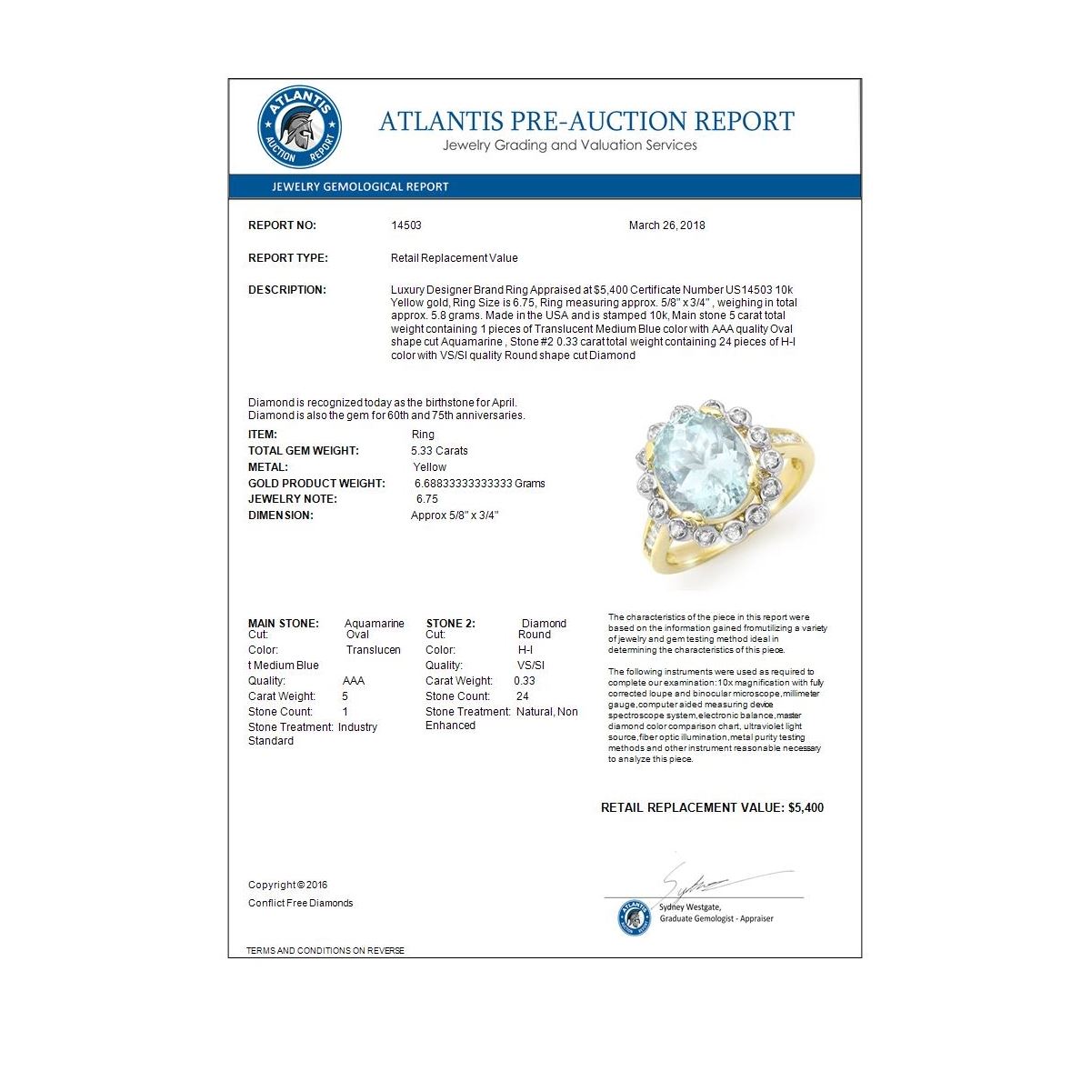 REF-81N8Y -14503 ---- 5.33 CTW Aquamarine & Diamond Ring 10K Yellow Gold ---- Luxury Designer Brand Ring Appraised at $5,400 Certificate Number US14503 10k Yellow gold, Ring Size is 6.75, Ring measuring approx. 5/8" x 3/4" , weighing in total approx. 5.8 grams. Made in the USA and is stamped 10k, Main stone 5 carat total weight containing 1 pieces of Translucent Medium Blue color with AAA quality Oval shape cut Aquamarine , Stone #2 0.33 carat total weight containing 24 pieces of H-I color with VS/SI quality Round shape cut Diamond