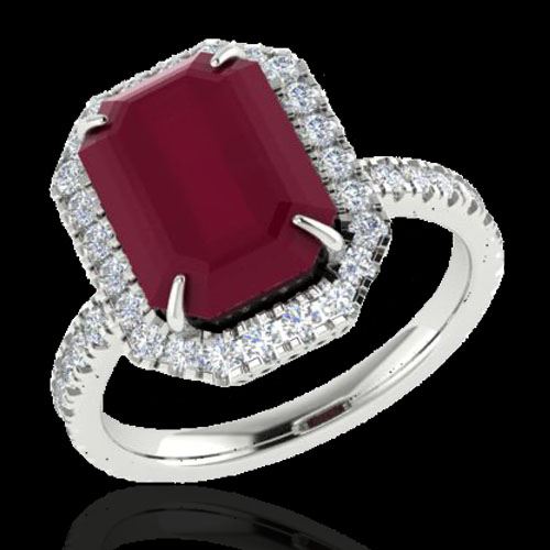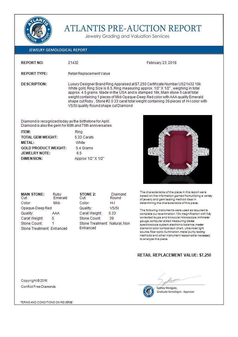 REF-94H4A -21432 ---- 5.33 CTW Ruby And Micro Pave VS/SI Diamond Halo Ring 18K White Gold ---- Luxury Designer Brand Ring Appraised at $7,250 Certificate Number US21432 18k White gold, Ring Size is 6.5, Ring measuring approx. 1/2" X 1/2" , weighing in total approx. 4.5 grams. Made in the USA and is stamped 18k, Main stone 5 carat total weight containing 1 pieces of Mid-Opaque-Deep Red color with AAA quality Emerald shape cut Ruby , Stone #2 0.33 carat total weight containing 39 pieces of H-I color with VS/SI quality Round shape cut Diamond
