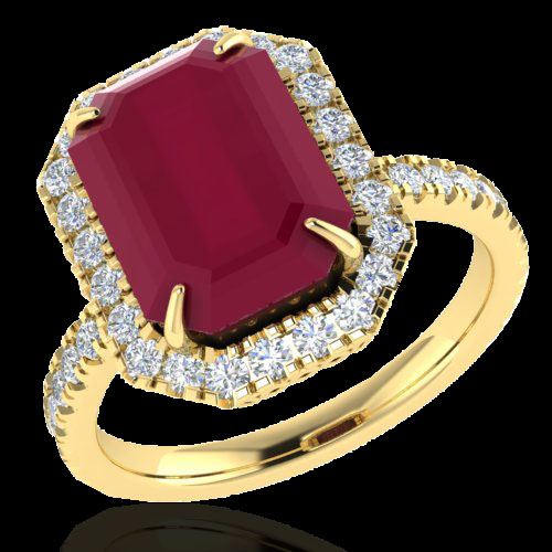 REF-94W4F -21433 ---- 5.33 CTW Ruby And Micro Pave VS/SI Diamond Halo Ring 18K Yellow Gold ---- Luxury Designer Brand Ring Appraised at $7,250 Certificate Number US21433 18k Yellow gold, Ring Size is 6.5, Ring measuring approx. 1/2" X 1/2" , weighing in total approx. 4.5 grams. Made in the USA and is stamped 18k, Main stone 5 carat total weight containing 1 pieces of Mid-Opaque-Deep Red color with AAA quality Emerald shape cut Ruby , Stone #2 0.33 carat total weight containing 39 pieces of H-I color with VS/SI quality Round shape cut Diamond