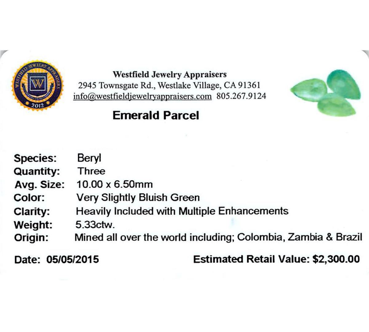 Three pear mixed cut natural emeralds, measuring 10.00 x 6.50 x 4.50mm, exact total weight 5.33ct., clarity is heavily included, type III, medium, very slightly grayish, very slightly bluish green color, (GIA vslbG 5/3), cut is good. Indications of multiple laboratory enhancements, including high temperature heat treatment. Westfield Appraised at $2,300.00.