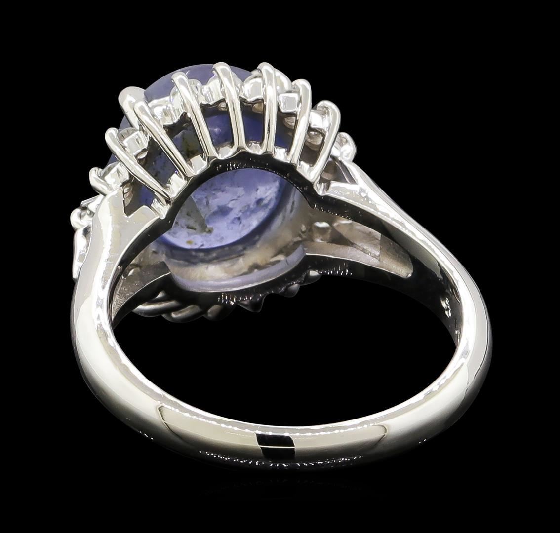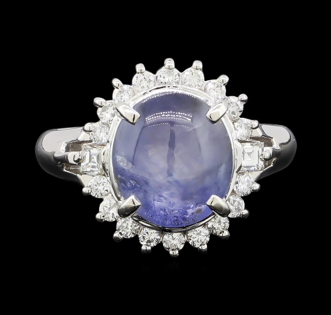 One ring featuring: Platinum containing Star Sapphire with a total weight of 5.33ct and Diamonds with a total weight of 0.43ct. Total Weight of Ring: 8.1 grams.