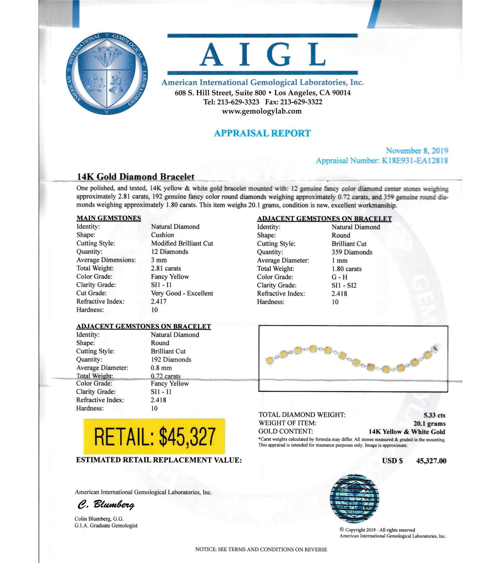 One polished, and tested, 14K yellow and white gold bracelet mounted with: 12 genuine fancy color diamond center stones weighing approximately 2.81 carats, 192 genuine fancy color round diamonds weighing approximately0.72 carats. and 359 genuine round diamonds weighing approximately 1.80 carats. This item weighs 20.1 grams, condition is new, excellent workmanship. #MAIN GEMSTONES# Identity: Natural Diamond Shape: CushionCutting Style: Modified Brilliant Cut Quantity: 12 Diamonds Average Dimensions: 3mm Total Weight: 2.81 carats Color Grade: Fancy Yellow Clarity Grade: SI1 - I1 Cut Grade: Very Good - Excellent Refractive Index: 2.417 Hardness: 10 #ADJACENT GEMSTONES ON BRACELET# Identity: Natural Diamond Shape: Round Cutting Style: Brilliant Cut Quantity: 359 Diamonds Average Diameter: 1mm Total Weight: 1.80 carats Color Grade: G - HClarity Grade: SI1 - SI2 Refractive Index: 2.418 Hardness: 10 #ADJACENT GEMSTONES ON BRACELET# Identity: Natural Diamond Shape: Round Cutting Style: Brilliant Cut Quantity: 192 Diamonds Average Diameter: 0.8mm Total